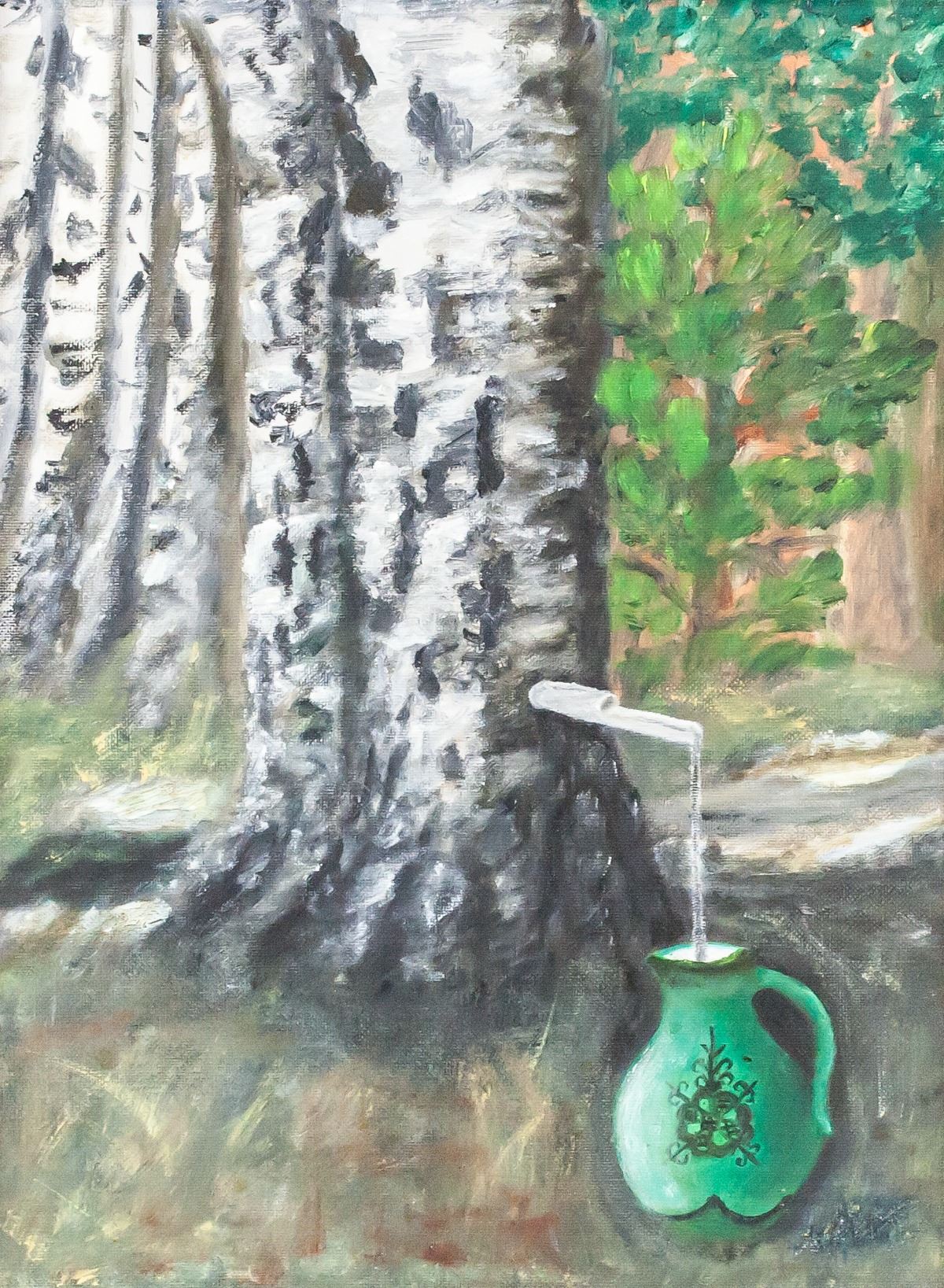 Acrylic on board, framed. Featuring a surrealist forest scene. Unsigned. 40 x 29 cm (15.75 x 11.75 inches), framed size: 46 x 36 cm (18 x 14 inches). Provenance: Toronto estate