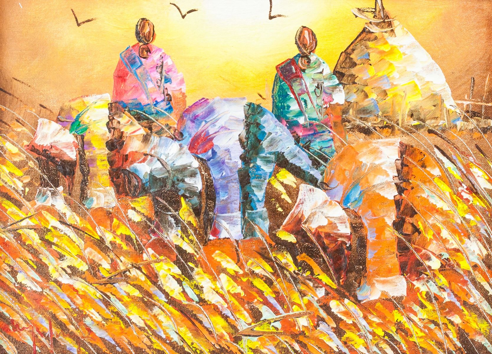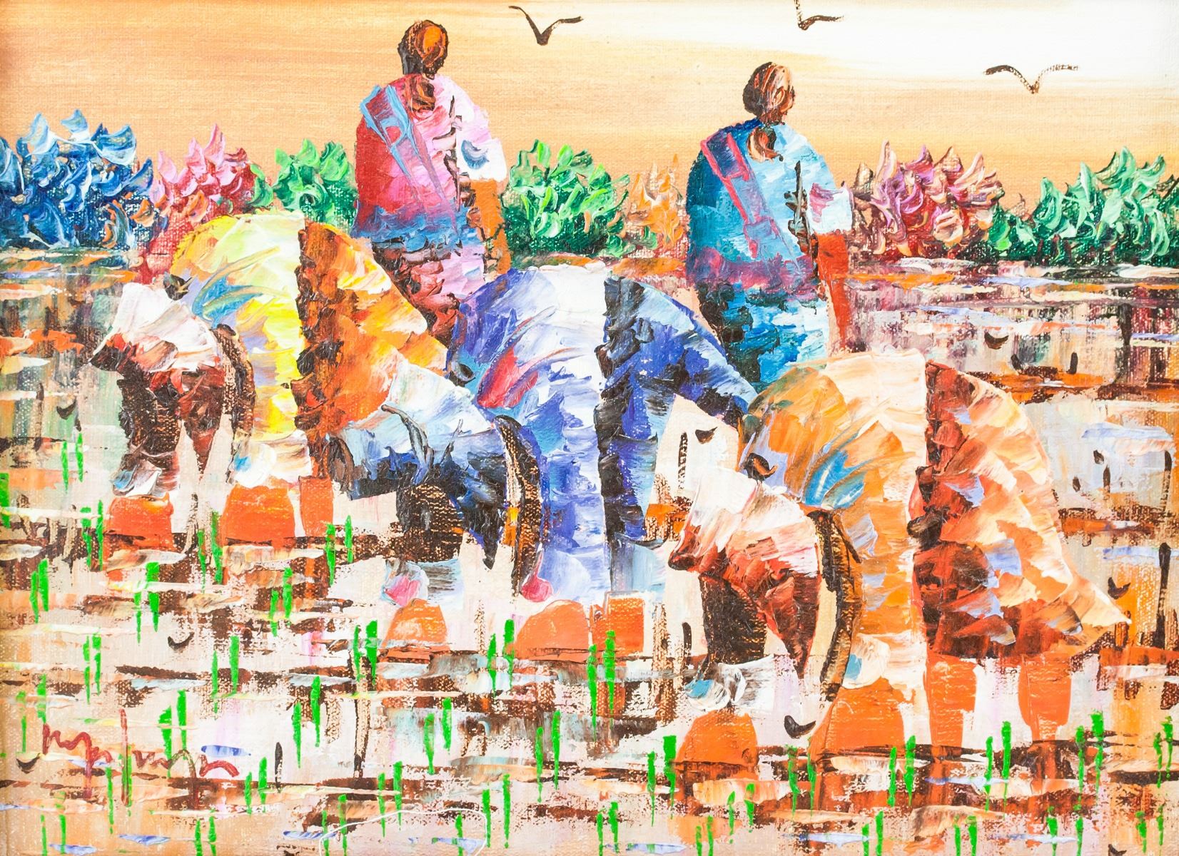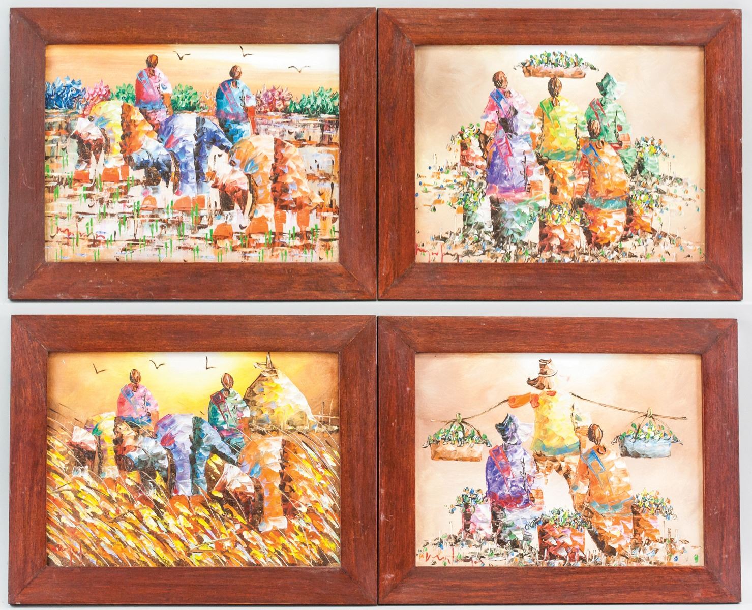 Acrylic on canvas, framed. Lot of four small paintings, featuring impressionist-style paintings of farmers at work. Singed by the artist. 21 x 29 cm (8.25 x 11.5 in), Frame: 29 x 37 cm (11.5 x 14.5 in) each.