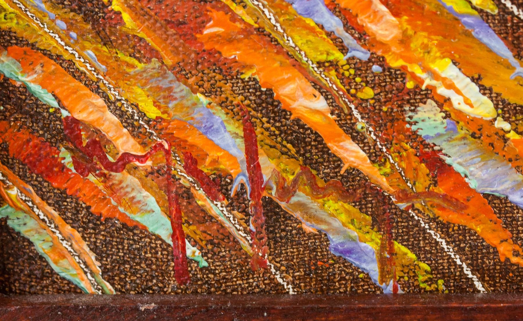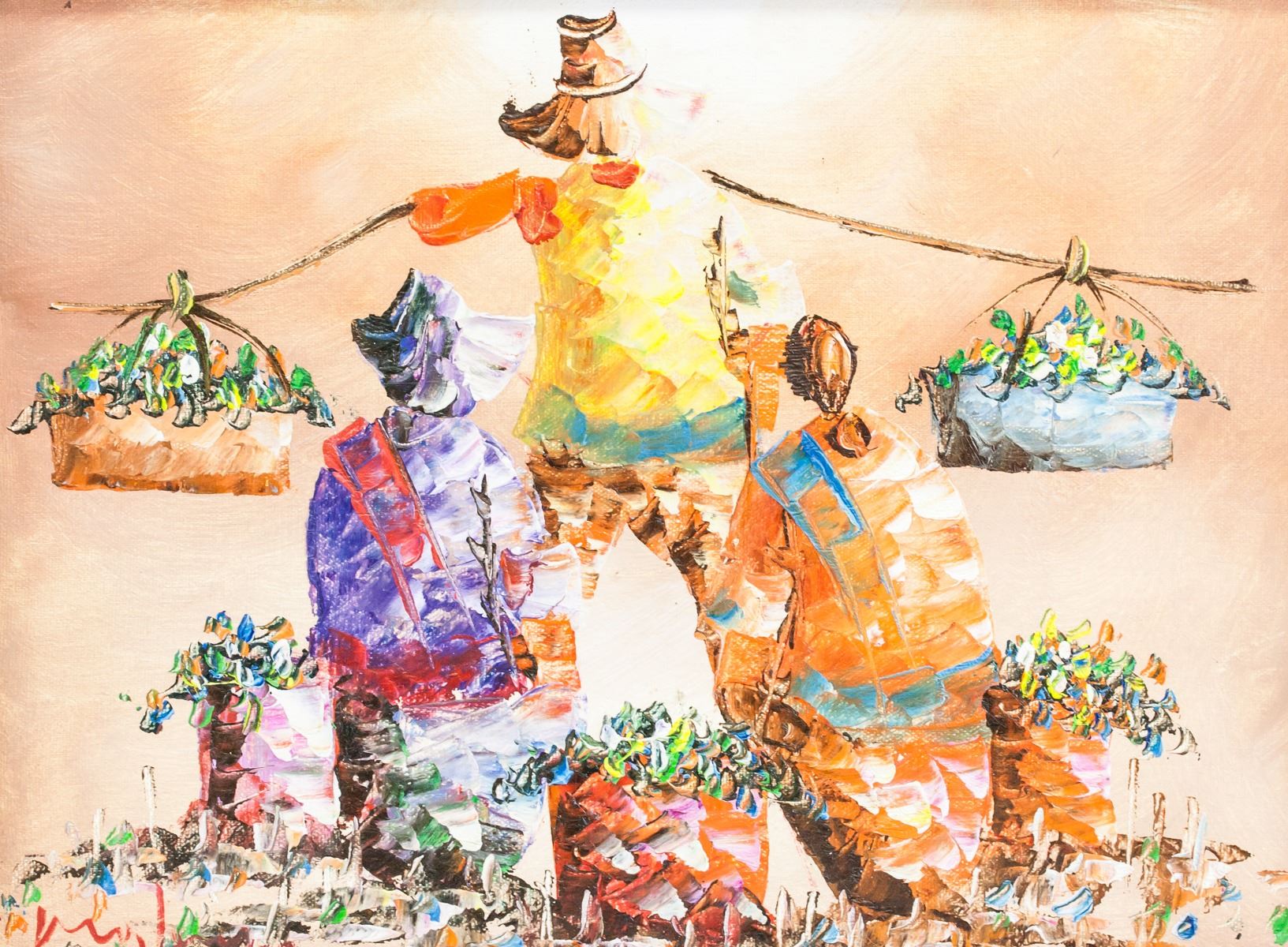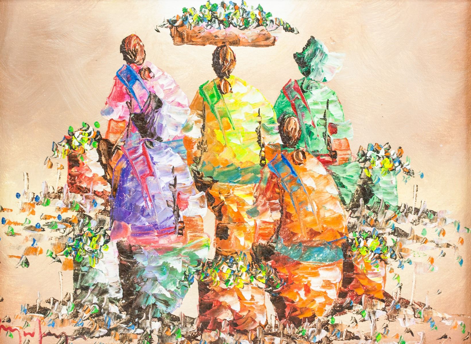 Acrylic on canvas, framed. Lot of four small paintings, featuring impressionist-style paintings of farmers at work. Singed by the artist. 21 x 29 cm (8.25 x 11.5 in), Frame: 29 x 37 cm (11.5 x 14.5 in) each.