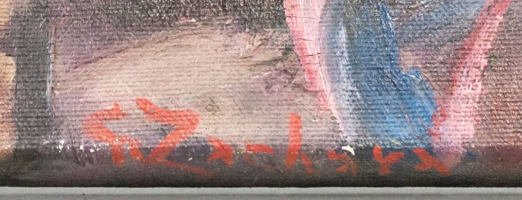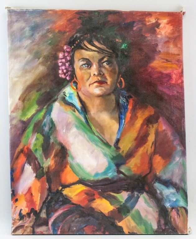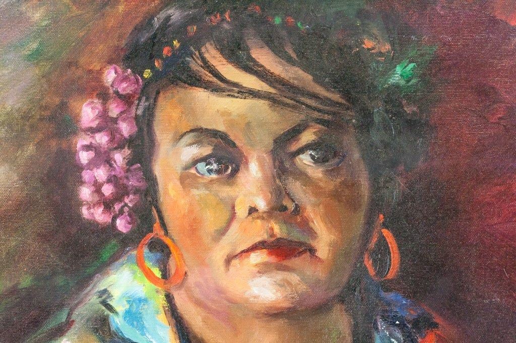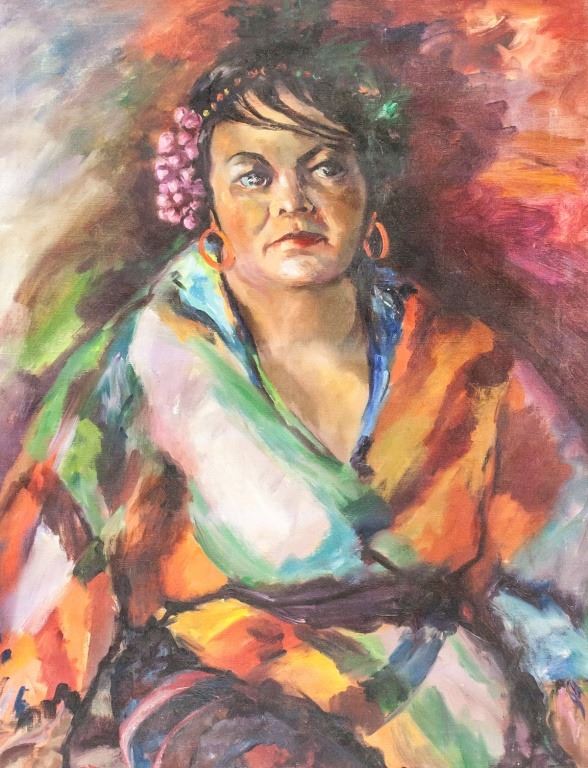 Acrylic on canvas. Featuring colorful portrait of a woman with large hoop earrings. Signed "G. Zachara" to the bottom left. 71 x 56 cm (28 x 22 inches).
