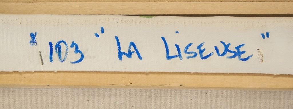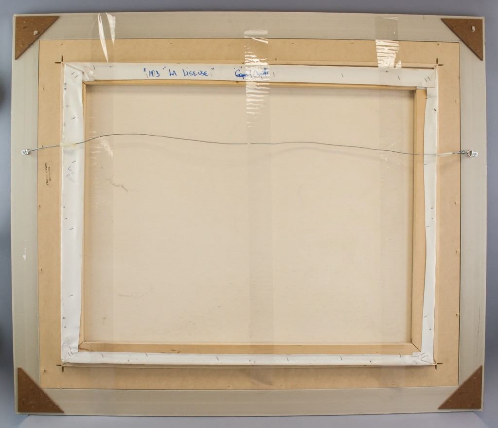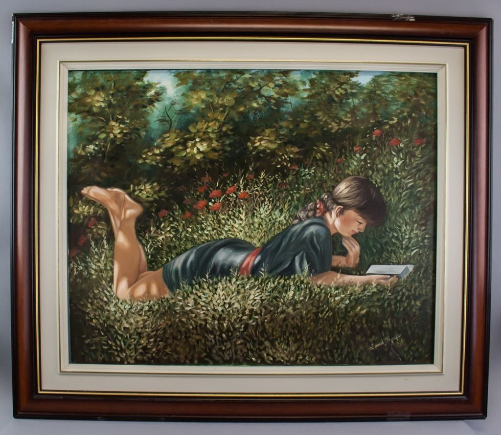 Acrylic on canvas, framed. Featuring a girl lying on the grass reading a book. Signed "Lucie Ayotte" to the bottom right corner. "103 La Liseuse" inscribed on stretcher bar. "Lucie Ayotte" inscribed on verso. Canvas size: 60 x 75 cm (23.5 x 29.5 inches). Frame size: 84 x 99 cm (33 x 39 inches).