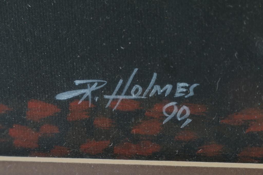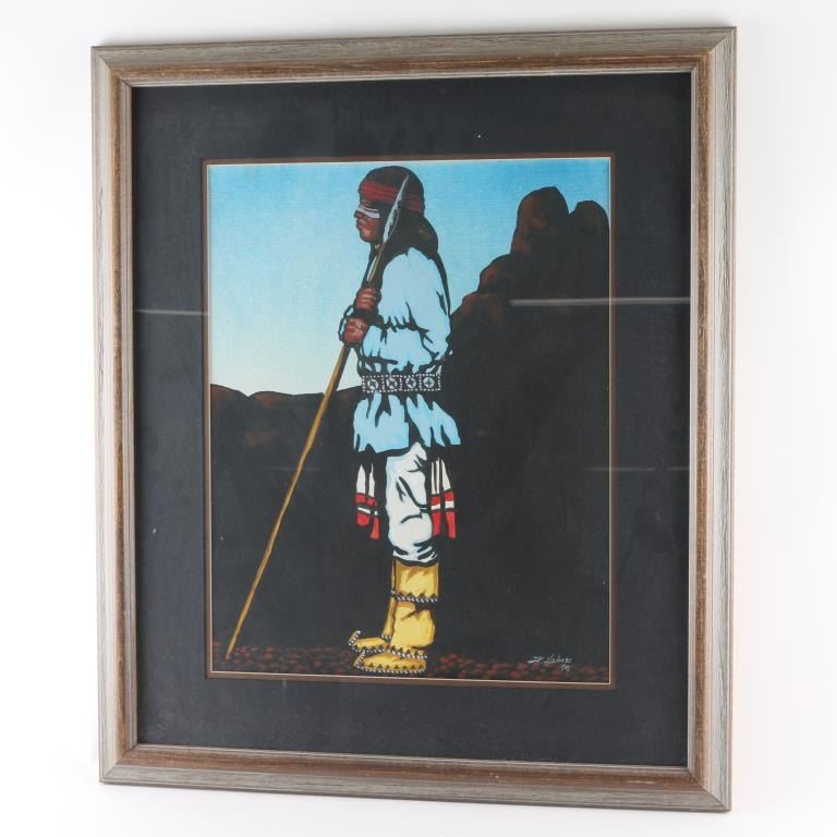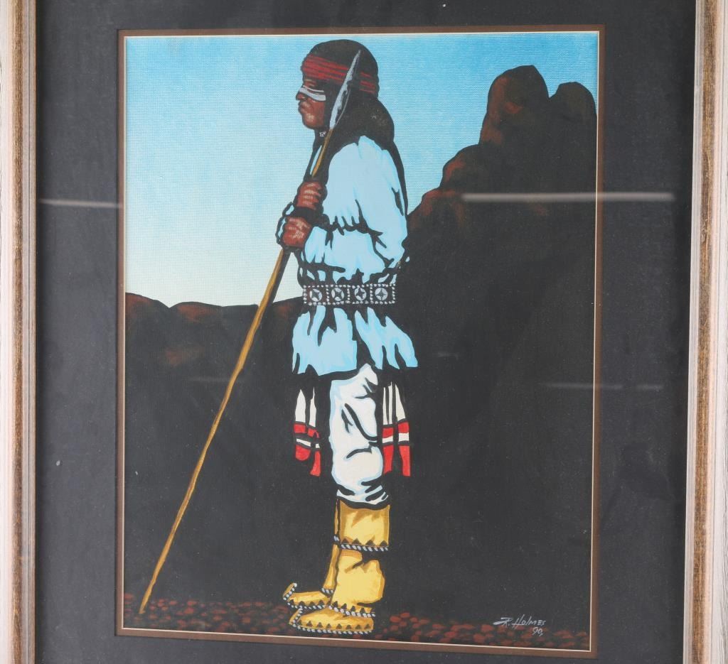 by R Holmes depicting indian with a spear, measures 20"x16".