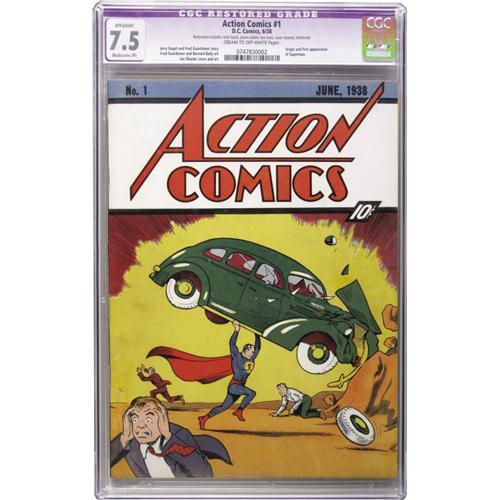 <B>Action Comics #1 (DC, 1938) CGC Apparent VF- 7.5 Moderate (P) Cream to off-white pages.</B></I> In comic collecting, nothing bestows bragging rights like a copy of <B>Action</B></I> #1, and this is one of the most visually appealing copies ever offered for public auction. We think collectors will appreciate what professional restoration has done for this copy: the large white, yellow, and orange cover surfaces, usually smudged on most any copy you'll find, are very attractive here. Considering that we've seen collectors gladly pay tidy sums even for moldy or hole-punched copies of this key book, we think this clean specimen is a purchase that will make a collector very happy. Beaming at you from the slab will be the most famous comic book cover of all time, and you will be holding in your hands the most <I>significant</B></I> comic ever as well. Of course, the issue has the first appearance of Superman, the most famous comic book character of all, written and drawn by his creators Jerry Siegel and Joe Shuster. It's the number one comic in the hobby, and we expect it to retain that status for as long as comic books are collected. CGC notes, "Restoration includes: color touch, pieces added, tear seals, cover cleaned, reinforced." Overstreet 2006 GD 2.0 value = $39,000, VG 4.0 value = $78,000; FN 6.0 value = $117,000; VF 8.0 value = $240,000.<BR><BR><b>Shipping:</b> Slabbed Comic (<a target="_blank" href="http://www.heritageauctions.com/common/shipping.php">view shipping information</a>)