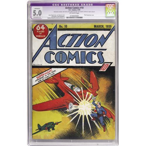 <B>Action Comics #10 (DC, 1939) CGC Apparent VG/FN 5.0 Extensive (P) Off-white pages.</B></I> We've only offered this issue on one other occasion, and not since 2003! The nice colors on this cover really stand out. It's the third Superman cover on the famous title and was done by Supes' co-creator Joe Shuster. Shuster, Fred Guardineer, Sheldon Moldoff, and Bernard Baily contributed interior art for this pre-1940 issue. CGC notes, "Restoration includes: color touch, pieces added, tear seals, cover cleaned, reinforced, staples replaced." Overstreet 2006 GD 2.0 value = $1,933; VG 4.0 value = $3,866; FN 6.0 value = $5,800.<BR><BR><b>Shipping:</b> Slabbed Comic (<a target="_blank" href="http://www.heritageauctions.com/common/shipping.php">view shipping information</a>)