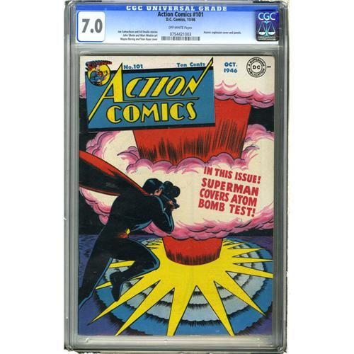 <B>Action Comics #101 (DC, 1946) CGC FN/VF 7.0 Off-white pages.</B></I> This memorable and somewhat chilling atomic explosion cover makes this issue stand <I>way</B></I> out from those preceding and following it! Wayne Boring is credited with the cover art. Overstreet 2006 FN 6.0 value = $423; VF 8.0 value = $881. CGC census 3/06: 2 in 7.0, 3 higher.
