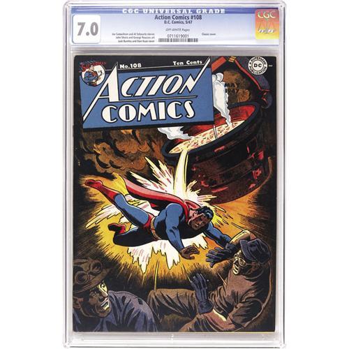 <B>Action Comics #108 (DC, 1947) CGC FN/VF 7.0 Off-white pages.</B></I> Overstreet dubs this a "classic molten metal" cover, but the "classic" part is Superman saving two innocents from said metal! The unusual grey tone cover scene drawn by Jack Burnley makes the issue highly collectible, and it's one we haven't seen too often. Overstreet 2006 FN 6.0 value = $222; VF 8.0 value = $463. CGC census 5/06: 1 in 7.0, 6 higher. <BR><BR><B>Important notice:</B> Heritage usually auctions material at the rate of 200-250 lots per hour. On some occasions eBay Live bid software or the Internet may not be able to keep up with the pace of the auction. We recommend placing a realistic absentee bid now as insurance to avoid disappointment. Occasionally the auctioneer may eliminate or reject an eBay Live bid, and the auctioneer may also reopen a lot after the close of the eBay live bidding (usually because we missed an audience bid), and may reject your bid even if it shows you as the winning bidder. By bidding via eBay Live, you agree that Heritage may award the lot to another bidder at its sole discretion under the circumstances described above or any other reasonable circumstances. Since eBay bids are not shown to us until we open the lot on the floor, we treat those bids just like floor bids. In most cases the floor responds before the eBay bid is presented to us, due to Internet lag time, so for consistency we have made it a policy that floor bids are always considered first over tie eBay live bids. Also please note that all Heritage lots purchased through eBay Live carry a 22.5% Buyer's Premium. Please make sure you read the Terms and Conditions before you bid. This lot is being auctioned in conjunction with a live floor auction by Heritage Auction Galleries. All final auction and invoice information will be supplied by Heritage Auction Galleries, and all other information should be considered preliminary. Lot:41001 <BR><BR><B>Winning Notification and Billing:</B> After the FINAL session in this auction is complete, Heritage will send e-mail and snail mail invoices. This process normally takes several days. All final auction and invoice information will be supplied by Heritage Auction Galleries, and all other information should be considered preliminary. <BR><BR>This auction will be conducted on a live auction floor and over the Internet through eBay Live. If you choose to place an absentee bid, please take a moment to <font color='#0000ff'><u><a href='http://pages.ebay.com/liveauctions/help/before/laabsentee.html'>learn how eBay Live absentee bidding works</a></u></font><font color='#000000'>