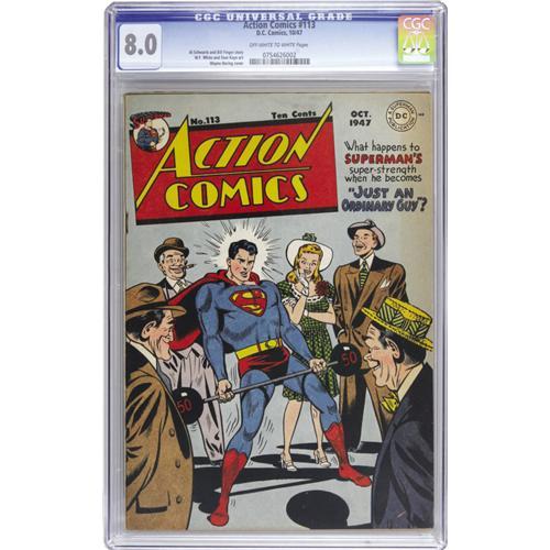 <B>Action Comics #113 (DC, 1947) CGC VF 8.0 Off-white to white pages.</B></I> Wayne Boring cover art is featured. Overstreet 2006 VF 8.0 value = $419. CGC census 9/06: 1 in 8.0, 2 higher.<BR><BR><b>Shipping:</b> Slabbed Comic (<a target="_blank" href="http://www.heritageauctions.com/common/shipping.php">view shipping information</a>)