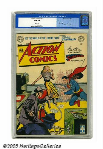 <B>Action Comics #142 (DC, 1950) CGC NM 9.4 White pages.</B></I> Given this book's white cover, a 9.4 is a "super" grade indeed, and this copy leads CGC's census by quite a margin, with an 8.5 copy the runner-up as of this writing. Wayne Boring drew the cover as well as the Superman story, which has our hero tangling with a pickpocket who managed to get hold of some Kryptonite. There's also a Tommy Tomorrow backup feature with Curt Swan art. Overstreet 2005 NM- 9.2 value = $700. CGC census 6/05: 1 in 9.4, none higher.