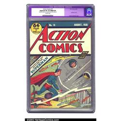 Action Comics #15 (DC, 1939) CGC Apparent VF 8.0 Slight (P) Off-white pages. It was apparent by this issue that Superman was selling Action Comics, evidenced by his more frequent cover appearances. This copy has a bright, clean look to it, with only the cover having been cleaned and reinforced. Overstreet 2002 VF 8.0 value = $3,600. Important notice: We expect to be auctioning lots at the rate of 200-250 per hour. Sometimes eBay Premier live bid software cannot keep up with that pace, so we strongly recommend that you place a realistic proxy bid now as insurance to avoid disappointment. Also please note that all Heritage/CAA lots purchased through eBay Premier carry a 20% Buyer's Premium. Please make sure you read the Terms and Conditions.