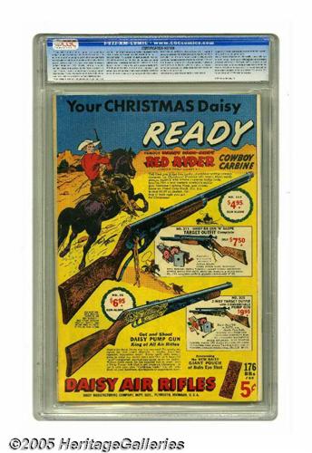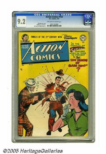 <B>Action Comics #153 (DC, 1951) CGC NM- 9.2 Off-white to white pages.</B></I> A mob boss orders a hit on Clark Kent, and though Clark's super powers let him survive all the murder attempts unscathed, how's he going to do it without revealing his secret identity? That's all in a story drawn by Al Plastino; the issue's cover is by Win Mortimer. You won't find a nicer copy than this one; as of this writing, this is the only copy certified with a grade above VF by CGC. Overstreet 2005 NM- 9.2 value = $700. CGC census 6/05: 1 in 9.2, none higher.