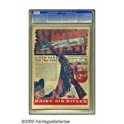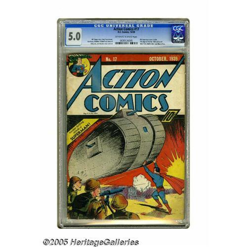 <B>Action Comics #17 (DC, 1939) CGC VG/FN 5.0 Off-white to white pages.</B></I>This issue's war cover was only the sixth cover appearance overall for Superman! The cover is by the character's co-creator Joe Shuster, who along with writer Jerry Siegel produced this issue's Superman story. The issue's other artists include Bob Kane, Bernard Baily, George Papp, and Fred Guardineer. Note that the highest-graded copy in CGC's census is only a 7.0 as of this writing, so this mid-grade offering is one of the better ones you're going to find. Overstreet 2005 VG 4.0 value = $994; FN 6.0 value = $1,490. CGC census 9/05: 1 in 5.0, 7 higher. <BR><BR><B>Important notice:</B> Heritage usually auctions material at the rate of 200-250 lots per hour. On some occasions eBay Live bid software or the Internet may not be able to keep up with the pace of the auction. We recommend placing a realistic absentee bid now as insurance to avoid disappointment. Occasionally the auctioneer may eliminate or reject an eBay Live bid, and the auctioneer may also reopen a lot after the close of the eBay live bidding (usually because we missed an audience bid), and may reject your bid even if it shows you as the winning bidder. By bidding via eBay Live, you agree that Heritage may award the lot to another bidder at its sole discretion under the circumstances described above or any other reasonable circumstances. Since eBay bids are not shown to us until we open the lot on the floor, we treat those bids just like floor bids. In most cases the floor responds before the eBay bid is presented to us, due to Internet lag time, so for consistency we have made it a policy that floor bids are always considered first over tie eBay live bids. Also please note that all Heritage lots purchased through eBay Live carry a 20% Buyer's Premium. Please make sure you read the Terms and Conditions before you bid. This lot is being auctioned in conjunction with a live floor auction by Heritage Galleries & Auctioneers. All f