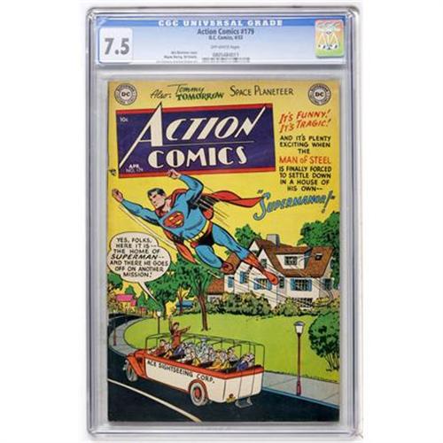 <B>Action Comics #179 (DC, 1953) CGC VF- 7.5 Off-white pages.</B></I> Win Mortimer cover and Wayne Boring art. Currently, the only other CGC copy that comes close is a "3.5."Overstreet 2007 VF 8.0 value = $329. CGC census 1/08: 1 in 7.5, none higher. <I> From the Toronto Collection.</B></I><BR><BR><b>Shipping:</b> Comics - Slabbed (certified) (<a target="_blank" href="http://www.heritageauctions.com/common/shipping.php">view shipping information</a>)