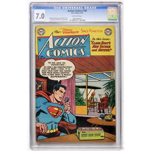 <B>Action Comics #189 (DC, 1954) CGC FN/VF 7.0 Off-white pages.</B></I> Pre-Silver Age copies of the <B>Action</B></I> <B>Comics </B></I>series are increasing in popularity among collectors, so here is an excellent opportunity to obtain an attractive copy. Superman cover by Win Mortimer. Curt Swan art. Tommy Tomorrow, Congo Bill, and Vigilante backup features. Overstreet 2007 FN 6.0 value = $156; VF 8.0 value = $317. CGC census 1/08: 1 in 7.0, 2 higher. <I> From the Toronto Collection.</B></I><BR><BR><b>Shipping:</b> Comics - Slabbed (certified) (<a target="_blank" href="http://www.heritageauctions.com/common/shipping.php">view shipping information</a>)