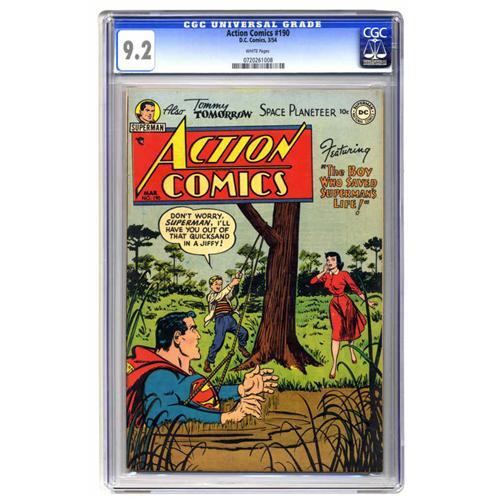 <B>Action Comics #190 (DC, 1954) CGC NM- 9.2 White pages.</B></I> While Mr. Mxyzptlk doesn't appear on the cover, he's behind the wacky situation depicted on the cover, all part of his scheme to humiliate Superman. Tommy Tomorrow and Congo Bill are among the backup features. These pre-Silver Age issues tend to be harder to find than their 1940s counterparts -- this is one of only two to be certified by CGC as of this writing (and the other's a mere VG 4.0). Overstreet 2005 NM- 9.2 value = $600. CGC census 11/05: 1 in 9.2, none higher.