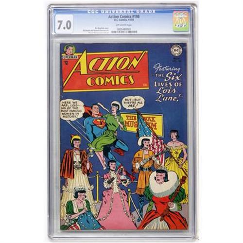 <B>Action Comics #198 (DC, 1954) CGC FN/VF 7.0 Off-white pages.</B></I> Superman and Lois Lane cover by Wayne Boring. Last Vigilante. Only one other copy of issue #198 has received a higher grade from CGC to date. Overstreet 2007 FN 6.0 value = $156; VF 8.0 value = $317. CGC census 1/08: 1 in 7.0, 1 higher. <I> From the Toronto Collection.</B></I><BR><BR><b>Shipping:</b> Comics - Slabbed (certified) (<a target="_blank" href="http://www.heritageauctions.com/common/shipping.php">view shipping information</a>)