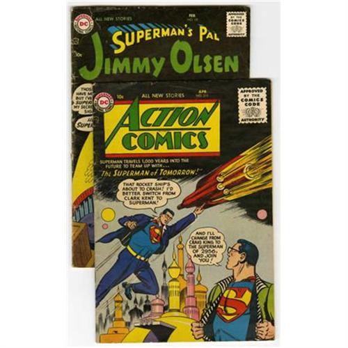 <B>Action Comics #215/Superman's Pal Jimmy Olsen #18 Group (DC, 1956-57).</B></I> Includes <B>Action </B></I>#215 (VG+) and <B>Jimmy Olsen </B></I>#18 (VG-). Approximate Overstreet value for group = $150.<BR><BR><b>Shipping:</b> Comics - Unslabbed (<a target="_blank" href="http://www.heritageauctions.com/common/shipping.php">view shipping information</a>)