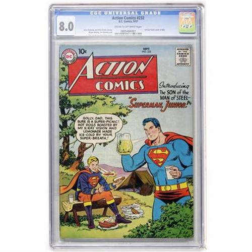 <B>Action Comics #232 (DC, 1957) CGC VF 8.0 Cream to off-white pages.</B></I> First Curt Swan cover in this title. Wayne Boring and Nick Cardy art. Overstreet 2007 VF 8.0 value = $268. CGC census 1/08: 1 in 8.0, 2 higher. <I> From the Toronto Collection.</B></I><BR><BR><b>Shipping:</b> Comics - Slabbed (certified) (<a target="_blank" href="http://www.heritageauctions.com/common/shipping.php">view shipping information</a>)