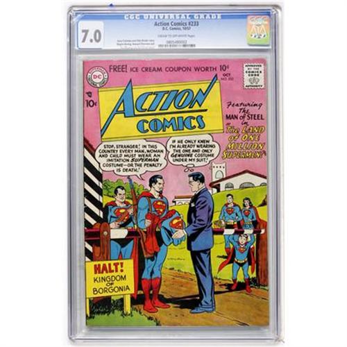 <B>Action Comics #233 (DC, 1957) CGC FN/VF 7.0 Cream to off-white pages.</B></I> Superman cover by Curt Swan. Wayne Boring art. Only two other copies of this issue have received a higher grade from CGC to date. Overstreet 2007 FN 6.0 value = $120; VF 8.0 value = $235. CGC census 1/08: 1 in 7.0, 2 higher. <I> From the Toronto Collection.</B></I><BR><BR><b>Shipping:</b> Comics - Slabbed (certified) (<a target="_blank" href="http://www.heritageauctions.com/common/shipping.php">view shipping information</a>)