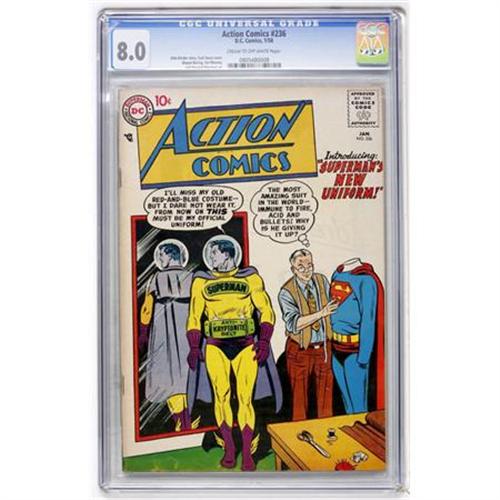 <B>Action Comics #236 (DC, 1958) CGC VF 8.0 Cream to off-white pages.</B></I> An interesting uniform change for Superman as rendered on this Curt Swan cover. Wayne Boring art. Only one other of issue #236 has received a higher grader from CGC to date. Overstreet 2007 VF 8.0 value = $235. CGC census 1/08: 1 in 8.0, 1 higher. <I> From the Toronto Collection.</B></I><BR><BR><b>Shipping:</b> Comics - Slabbed (certified) (<a target="_blank" href="http://www.heritageauctions.com/common/shipping.php">view shipping information</a>)