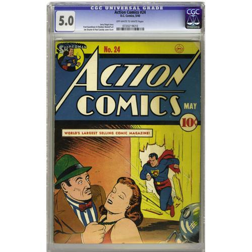 <B>Action Comics #24 (DC, 1940) CGC VG/FN 5.0 Off-white to white pages.</B></I> This issue finds our man Clark Kent now working for the <I>Daily Planet</B></I>, marking a change (from the <I>Daily Star</B></I>) that would figure heavily into the Superman mystique. Joe Shuster and Paul Cassidy provide the cover and lead story; other artists include Fred Guardineer and Sheldon Moldoff. Other than a small amount of paper loss in the upper right corner, this copy looks sharp and nicely preserved. Overstreet 2006 VG 4.0 value = $600; FN 6.0 value = $900. CGC census 03/06: 1 in 5.0, 4 higher.