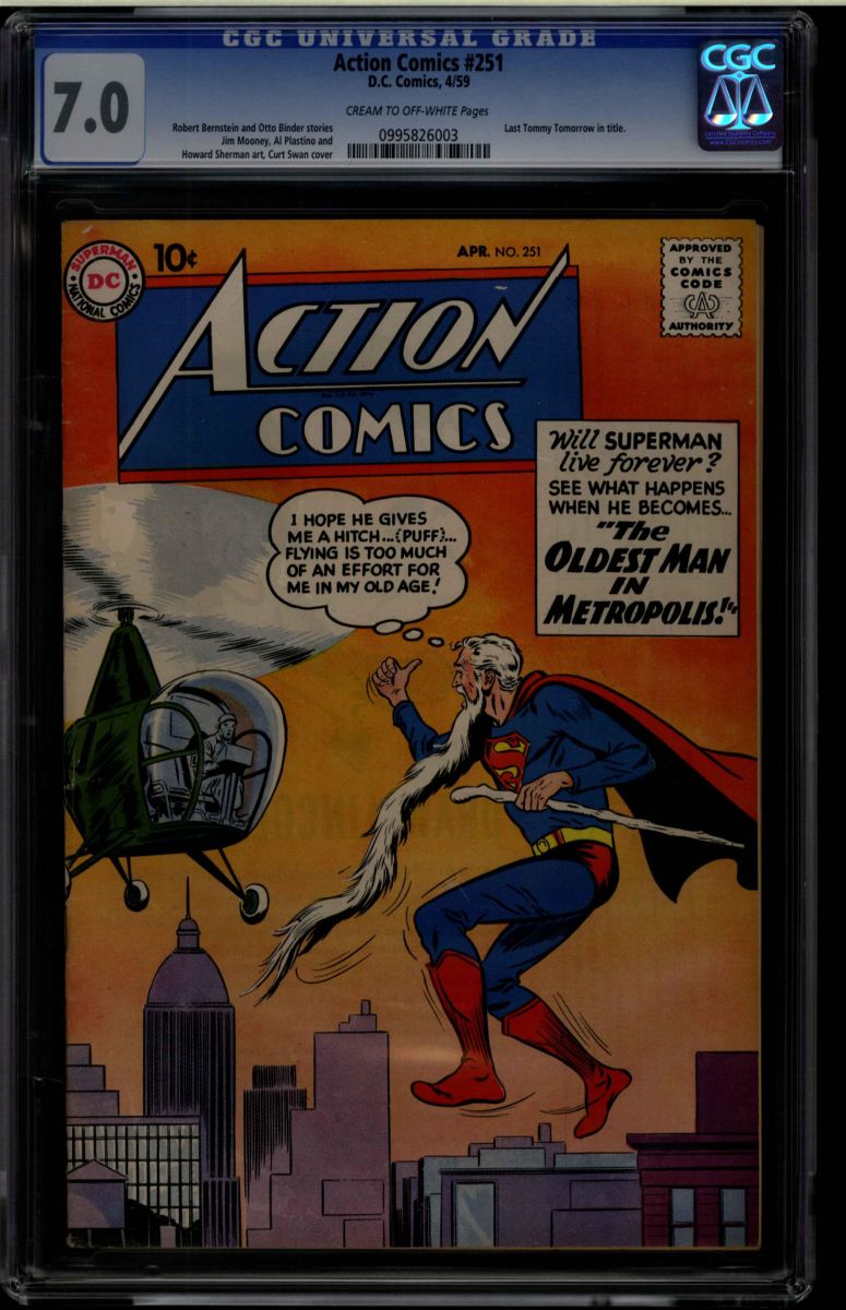 Action Comics #251 CGC 7.0 cream to off-white pages. Robert Bernstein and Otto Binder stories. Jim Mooney, Al Plastino and Howard Sherman art, Curt Swan cover. Last Tommy Tomorrow in title. Overstreet 2009 FN 6.0 value = $114, VF 8.0 value = $226. CGC census: 5 at 7.0, 4 higher.