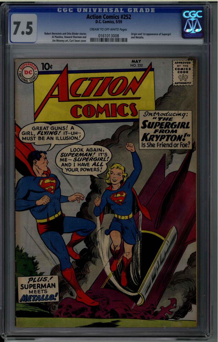 Action Comics #252 CGC 7.5 cream to off white pages. Origin and 1st appearance of Supergirl. Overstreet 2009 FN 6.0 value = $540; VF 8.0 value = $1,575. CGC census reports 9 at 7.5 (1 restored), 8 at 8.0, 4 at 8.5 & 4at 9.0