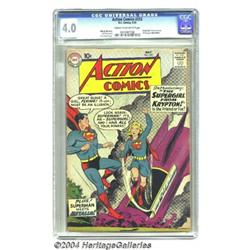 <B>Action Comics #252 (DC, 1959) CGC VG 4.0 Cream to off-white pages.</B></I> This unforgettable issue featured the first appearance of Supergirl. Curt Swan cover, with Al Plastino interior art. Overstreet 2004 VG 4.0 value = $286. <BR><BR><B>Important notice:</B> Heritage usually auctions material at the rate of 200-250 lots per hour. On some occasions eBay Live bid software or the Internet may not be able to keep up with the pace of the auction. We recommend placing a realistic absentee bid now as insurance to avoid disappointment. Occasionally the auctioneer may eliminate or reject an eBay Live bid, and the auctioneer may also reopen a lot after the close of the eBay live bidding (usually because we missed an audience bid), and may reject your bid even if it shows you as the winning bidder. By bidding via eBay Live, you agree that Heritage may award the lot to another bidder at its sole discretion under the circumstances described above or any other reasonable circumstances. Since eBay bids are not shown to us until we open the lot on the floor, we treat those bids just like floor bids. In most cases the floor responds before the eBay bid is presented to us, due to Internet lag time, so for consistency we have made it a policy that floor bids are always considered first over tie eBay live bids. Also please note that all Heritage lots purchased through eBay Live carry a 20% Buyer's Premium. Please make sure you read the Terms and Conditions before you bid. </span></font></tr></table></td></tr></table>