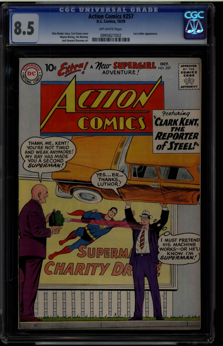 Action Comics #257 CGC 8.5 off-white pages. Otto Binder story. Curt Swan cover. Wayne Boring, Jim Mooney, and Howard Sherman art. Lex Luthor appearance. Overstreet 2009 VF 8.0 value = $147, VF/NM 9.0 value = $236. CGC census: 2 at 8.5, 3 higher.
