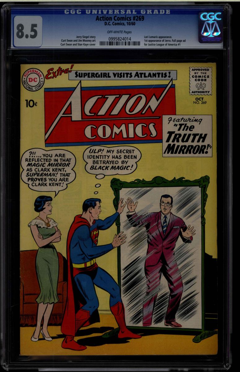 Action Comics #269 CGC 8.5 off-white pages. Jerry Siegel story. Curt Swan and Jim Mooney art. Curt Swan and Stan Kaye cover. Lori Lemaris appearance. 1st appearance of Jerro. Full page ad for Justice League of America #1. Overstreet 2009 VF 8.0 value = $127, VF/NM 9.0 value = $204. CGC census: 1 at 8.5, 2 higher.
