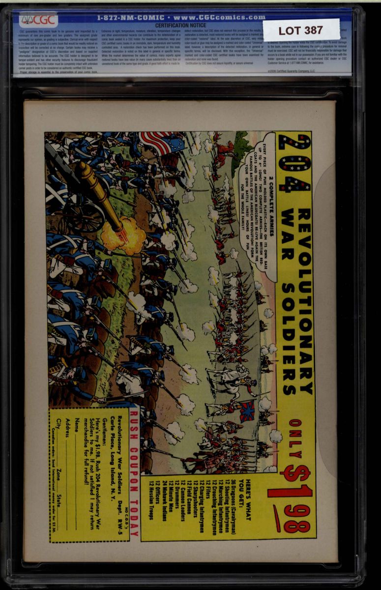 The Auctioneer has reserved the right to reject any and all bids, and to bid at the auction. Auctioneers Auctions are not on approval. Auctioneer does not allow certified material to be returned because of possible differences of opinion with respect to the grade offered by any third party organization, dealer, or service. Absolutely no guarantee of grade is offered for un-certified property sold and subsequently submitted to a third-party grading service. There will be no exceptions to this policy. Under extremely limited circumstances, (e.g. gross cataloging error) a purchaser, who did not bid from the floor, may request Auctioneer to evaluate voiding a sale; such request must be made in writing detailing the alleged gross error, and submission of the lot to the Auctioneer must be pre-approved by the Auctioneer. Bidder must notify Auctioneer in writing of such request within three (3) days of the non-floor bidder receipt of the lot. Any lot that is to be evaluated must be in our offices within 30 days after Auction. Grading does not qualify for this evaluation process nor do such complaints constitute a basis to challenge the authenticity of a lot. AFTER THAT 30-DAY PERIOD, NO LOTS MAY BE RETURNED FOR REASONS OTHER THAN AUTHENTICITY. Lots returned must be housed intact in the original holder. No lots purchased by floor Bidders may be returned (including those Bidders acting as agents for others). Late remittance for purchases may be considered just cause to revoke all return privileges. B: Auctions conducted solely on the Internet have a THREE (3) DAY RETURN POLICY: Lots paid for within seven days of the Auction closing are sold with a three (3) day return privilege. You may return lots under the following conditions: Within three days of receipt of the lot, you must first notify Auctioneer by contacting Client Service by phone (314-680-8599) or e-mail (moundcityauctions@gmail.com), and immediately mail the lot(s) fully insured to the attention of Returns, Mound City Auctions 1081 Teson Rd. Hazelwood, MO. 63042. Lots must be housed intact in their original holder and in their original condition. You are responsible for the insured, safe delivery of any lots. Auctioneer will not be responsible for lots returned in non-registered mail or lots returned without prior authorization per section B. A non-negotiable return fee of 5% of the purchase price ($10 per lot minimum) will be deducted from the refund for each returned lot or billed directly. Postage and handling fees are not refunded. After the three-day period (from receipt), no items may be returned for any reason. Late remittance for purchases revokes all Return-Restock privileges. C: Bidders who have inspected the lots prior to the auction will not be granted any return privileges. D: Comic books sold referencing a third-party grading service are sold “as is” without any express or implied warranty. Certain warranties may be available from the grading services and the Bidder is referred to them for further details: Certified Guaranty Company, LLC. (CGC), P.O. Box 4738, Sarasota, FL 34230. E: Bidders who intend to challenge authenticity or provenance of a lot must notify Auctioneer in writing within thirty (30) days of the Auctions conclusion. In the event Auctioneer cannot deliver the lot or subsequently it is established that the lot lacks title, provenance, authenticity, or other transfer or condition issue is claimed, Auctioneer's liability shall be limited to rescission of sale and refund of purchase price; in no case shall Auctioneer's maximum liability exceed the high bid on that lot, which bid shall be deemed for all purposes the value of the lot. After one year has elapsed, Auctioneer's maximum liability shall be limited to any commissions and fees Auctioneer earned on that lot. F: All comics are guaranteed genuine, but are not guaranteed as to grade, since grading is a matter of opinion, an art and not a science, and therefore the opinion rendered by the Auctioneer or any third party grading service may not agree with the opinion of others (including trained experts), and the same expert may not grade the same item with the same grade at two different times. G: Since we cannot examine encapsulated comics, they are sold “as is”without our grading opinion, and may not be returned for any reason. Auctioneer shall not be liable for any patent or latent defect or controversy pertaining to or arising from any encapsulated collectible. In any such instance, purchaser's remedy, if any, shall be solely against the service certifying the collectible. H: Due to changing grading standards over time, differing interpretations, and to possible mishandling of items by subsequent owners, Auctioneer reserves the right to grade items differently than shown on certificates from any grading service that accompany the items. Auctioneer also reserves the right to grade items differently than the grades shown in the prior catalog should such items be reconsigned to any future auction. I: Although consensus grading is employed by most grading services, it should be noted as aforesaid that grading is not an exact science. In fact, it is entirely possible that if a lot is broken out of a plastic holder and resubmitted to another grading service or even to the same service, the lot could come back with a different grade assigned. J: Certification does not guarantee protection against the normal risks associated with potentially volatile markets. The degree of liquidity for certified collectibles will vary according to general market conditions and the particular lot involved. For some lots there may be no active market at all at certain points in time."