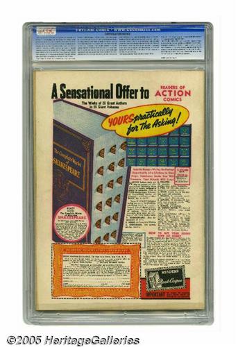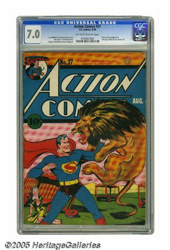 <B>Action Comics #27 (DC, 1940) CGC FN/VF 7.0 Off-white to white pages.</B></I> Superman didn't always battle supervillains in his early days -- after taking on a lion on this cover by Paul Cassidy, he fights for justice inside the book by taking on Mr. and Mrs. Tweed, the corrupt owners of a home for wayward boys. Notable backup features include the Black Pirate by Sheldon Moldoff, and Tex Thomson with art by Bernard Baily. Overstreet 2005 FN 6.0 value = $762; VF 8.0 value = $1,588. CGC census 5/05: 3 in 7.0, 2 higher.