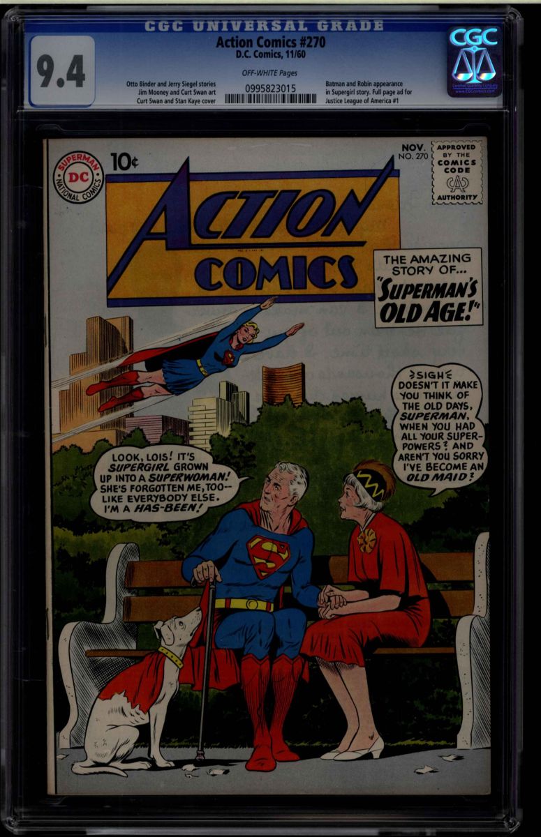 Action Comics #270 CGC 9.4 off-white pages. Otto Binder and Jerry Siegel stories. Jim Mooney and Curt Swan art, Curt Swan and Stan Kaye cover. Batman and Robin appearance in Supergirl story. Full page ad for Justice League of America #1. Overstreet 2009 NM 9.2 value = $280. CGC census: 1 at 9.4, none higher!