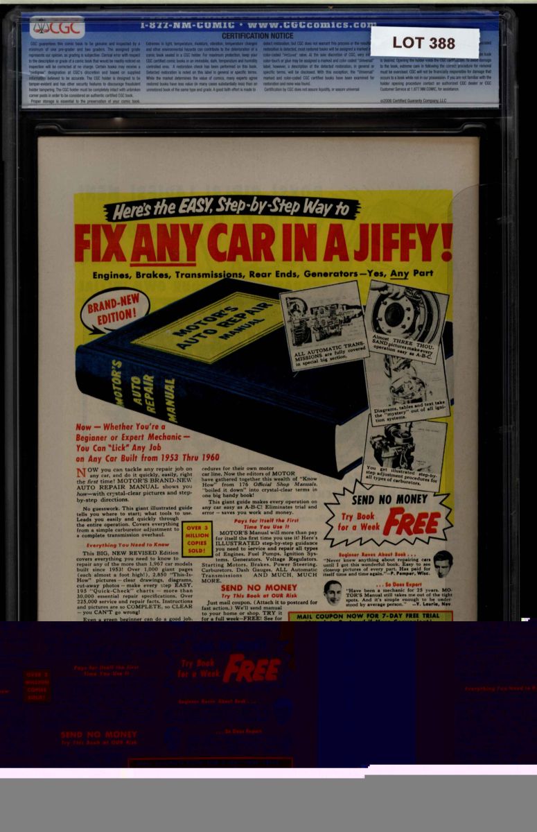 The Auctioneer has reserved the right to reject any and all bids, and to bid at the auction. Auctioneers Auctions are not on approval. Auctioneer does not allow certified material to be returned because of possible differences of opinion with respect to the grade offered by any third party organization, dealer, or service. Absolutely no guarantee of grade is offered for un-certified property sold and subsequently submitted to a third-party grading service. There will be no exceptions to this policy. Under extremely limited circumstances, (e.g. gross cataloging error) a purchaser, who did not bid from the floor, may request Auctioneer to evaluate voiding a sale; such request must be made in writing detailing the alleged gross error, and submission of the lot to the Auctioneer must be pre-approved by the Auctioneer. Bidder must notify Auctioneer in writing of such request within three (3) days of the non-floor bidder receipt of the lot. Any lot that is to be evaluated must be in our offices within 30 days after Auction. Grading does not qualify for this evaluation process nor do such complaints constitute a basis to challenge the authenticity of a lot. AFTER THAT 30-DAY PERIOD, NO LOTS MAY BE RETURNED FOR REASONS OTHER THAN AUTHENTICITY. Lots returned must be housed intact in the original holder. No lots purchased by floor Bidders may be returned (including those Bidders acting as agents for others). Late remittance for purchases may be considered just cause to revoke all return privileges. B: Auctions conducted solely on the Internet have a THREE (3) DAY RETURN POLICY: Lots paid for within seven days of the Auction closing are sold with a three (3) day return privilege. You may return lots under the following conditions: Within three days of receipt of the lot, you must first notify Auctioneer by contacting Client Service by phone (314-680-8599) or e-mail (moundcityauctions@gmail.com), and immediately mail the lot(s) fully insured to the attention of Returns, Mound City Auctions 1081 Teson Rd. Hazelwood, MO. 63042. Lots must be housed intact in their original holder and in their original condition. You are responsible for the insured, safe delivery of any lots. Auctioneer will not be responsible for lots returned in non-registered mail or lots returned without prior authorization per section B. A non-negotiable return fee of 5% of the purchase price ($10 per lot minimum) will be deducted from the refund for each returned lot or billed directly. Postage and handling fees are not refunded. After the three-day period (from receipt), no items may be returned for any reason. Late remittance for purchases revokes all Return-Restock privileges. C: Bidders who have inspected the lots prior to the auction will not be granted any return privileges. D: Comic books sold referencing a third-party grading service are sold “as is” without any express or implied warranty. Certain warranties may be available from the grading services and the Bidder is referred to them for further details: Certified Guaranty Company, LLC. (CGC), P.O. Box 4738, Sarasota, FL 34230. E: Bidders who intend to challenge authenticity or provenance of a lot must notify Auctioneer in writing within thirty (30) days of the Auctions conclusion. In the event Auctioneer cannot deliver the lot or subsequently it is established that the lot lacks title, provenance, authenticity, or other transfer or condition issue is claimed, Auctioneer's liability shall be limited to rescission of sale and refund of purchase price; in no case shall Auctioneer's maximum liability exceed the high bid on that lot, which bid shall be deemed for all purposes the value of the lot. After one year has elapsed, Auctioneer's maximum liability shall be limited to any commissions and fees Auctioneer earned on that lot. F: All comics are guaranteed genuine, but are not guaranteed as to grade, since grading is a matter of opinion, an art and not a science, and therefore the opinion rendered by the Auctioneer or any third party grading service may not agree with the opinion of others (including trained experts), and the same expert may not grade the same item with the same grade at two different times. G: Since we cannot examine encapsulated comics, they are sold “as is”without our grading opinion, and may not be returned for any reason. Auctioneer shall not be liable for any patent or latent defect or controversy pertaining to or arising from any encapsulated collectible. In any such instance, purchaser's remedy, if any, shall be solely against the service certifying the collectible. H: Due to changing grading standards over time, differing interpretations, and to possible mishandling of items by subsequent owners, Auctioneer reserves the right to grade items differently than shown on certificates from any grading service that accompany the items. Auctioneer also reserves the right to grade items differently than the grades shown in the prior catalog should such items be reconsigned to any future auction. I: Although consensus grading is employed by most grading services, it should be noted as aforesaid that grading is not an exact science. In fact, it is entirely possible that if a lot is broken out of a plastic holder and resubmitted to another grading service or even to the same service, the lot could come back with a different grade assigned. J: Certification does not guarantee protection against the normal risks associated with potentially volatile markets. The degree of liquidity for certified collectibles will vary according to general market conditions and the particular lot involved. For some lots there may be no active market at all at certain points in time."