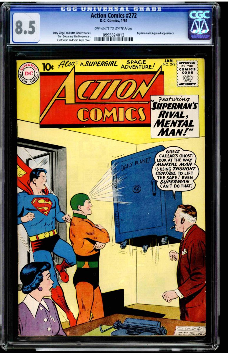 Action Comics #272 CGC 8.5 off-white to white pages. Jerry Siegel and Otto Binder stories. Curt Swan and Jim Mooney art. Curt Swan and Stan Kaye cover. Aquaman and Aqualad appearance. Overstreet 2009 VF 8.0 value = $112, VF/NM 9.0 value = $176. CGC census: 1 at 8.5, 5 higher.