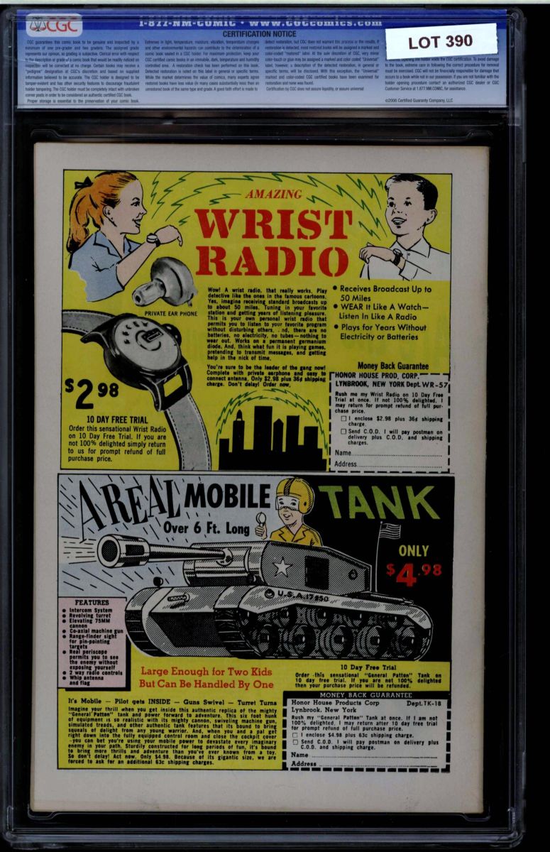 The Auctioneer has reserved the right to reject any and all bids, and to bid at the auction. Auctioneers Auctions are not on approval. Auctioneer does not allow certified material to be returned because of possible differences of opinion with respect to the grade offered by any third party organization, dealer, or service. Absolutely no guarantee of grade is offered for un-certified property sold and subsequently submitted to a third-party grading service. There will be no exceptions to this policy. Under extremely limited circumstances, (e.g. gross cataloging error) a purchaser, who did not bid from the floor, may request Auctioneer to evaluate voiding a sale; such request must be made in writing detailing the alleged gross error, and submission of the lot to the Auctioneer must be pre-approved by the Auctioneer. Bidder must notify Auctioneer in writing of such request within three (3) days of the non-floor bidder receipt of the lot. Any lot that is to be evaluated must be in our offices within 30 days after Auction. Grading does not qualify for this evaluation process nor do such complaints constitute a basis to challenge the authenticity of a lot. AFTER THAT 30-DAY PERIOD, NO LOTS MAY BE RETURNED FOR REASONS OTHER THAN AUTHENTICITY. Lots returned must be housed intact in the original holder. No lots purchased by floor Bidders may be returned (including those Bidders acting as agents for others). Late remittance for purchases may be considered just cause to revoke all return privileges. B: Auctions conducted solely on the Internet have a THREE (3) DAY RETURN POLICY: Lots paid for within seven days of the Auction closing are sold with a three (3) day return privilege. You may return lots under the following conditions: Within three days of receipt of the lot, you must first notify Auctioneer by contacting Client Service by phone (314-680-8599) or e-mail (moundcityauctions@gmail.com), and immediately mail the lot(s) fully insured to the attention of Returns, Mound City Auctions 1081 Teson Rd. Hazelwood, MO. 63042. Lots must be housed intact in their original holder and in their original condition. You are responsible for the insured, safe delivery of any lots. Auctioneer will not be responsible for lots returned in non-registered mail or lots returned without prior authorization per section B. A non-negotiable return fee of 5% of the purchase price ($10 per lot minimum) will be deducted from the refund for each returned lot or billed directly. Postage and handling fees are not refunded. After the three-day period (from receipt), no items may be returned for any reason. Late remittance for purchases revokes all Return-Restock privileges. C: Bidders who have inspected the lots prior to the auction will not be granted any return privileges. D: Comic books sold referencing a third-party grading service are sold “as is” without any express or implied warranty. Certain warranties may be available from the grading services and the Bidder is referred to them for further details: Certified Guaranty Company, LLC. (CGC), P.O. Box 4738, Sarasota, FL 34230. E: Bidders who intend to challenge authenticity or provenance of a lot must notify Auctioneer in writing within thirty (30) days of the Auctions conclusion. In the event Auctioneer cannot deliver the lot or subsequently it is established that the lot lacks title, provenance, authenticity, or other transfer or condition issue is claimed, Auctioneer's liability shall be limited to rescission of sale and refund of purchase price; in no case shall Auctioneer's maximum liability exceed the high bid on that lot, which bid shall be deemed for all purposes the value of the lot. After one year has elapsed, Auctioneer's maximum liability shall be limited to any commissions and fees Auctioneer earned on that lot. F: All comics are guaranteed genuine, but are not guaranteed as to grade, since grading is a matter of opinion, an art and not a science, and therefore the opinion rendered by the Auctioneer or any third party grading service may not agree with the opinion of others (including trained experts), and the same expert may not grade the same item with the same grade at two different times. G: Since we cannot examine encapsulated comics, they are sold “as is”without our grading opinion, and may not be returned for any reason. Auctioneer shall not be liable for any patent or latent defect or controversy pertaining to or arising from any encapsulated collectible. In any such instance, purchaser's remedy, if any, shall be solely against the service certifying the collectible. H: Due to changing grading standards over time, differing interpretations, and to possible mishandling of items by subsequent owners, Auctioneer reserves the right to grade items differently than shown on certificates from any grading service that accompany the items. Auctioneer also reserves the right to grade items differently than the grades shown in the prior catalog should such items be reconsigned to any future auction. I: Although consensus grading is employed by most grading services, it should be noted as aforesaid that grading is not an exact science. In fact, it is entirely possible that if a lot is broken out of a plastic holder and resubmitted to another grading service or even to the same service, the lot could come back with a different grade assigned. J: Certification does not guarantee protection against the normal risks associated with potentially volatile markets. The degree of liquidity for certified collectibles will vary according to general market conditions and the particular lot involved. For some lots there may be no active market at all at certain points in time."