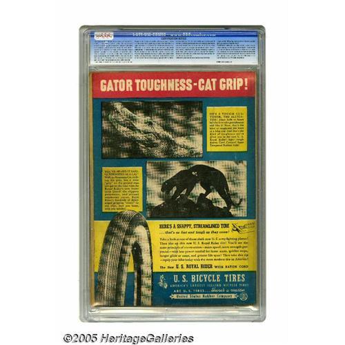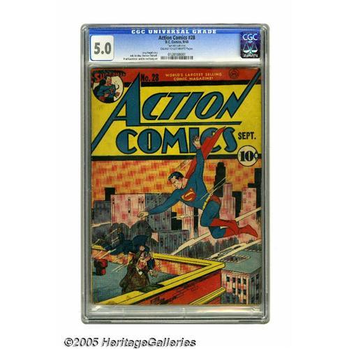 <B>Action Comics #28 (DC, 1940) CGC VG/FN 5.0 Cream to off-white pages.</B></I> This modest mid-grade copy hasn't been bested by many other copies certified by CGC to date, only one of which earned a grade better than VF 8.0. DC Golden Age greats Jack Burnley, Sheldon Moldoff, Fred Guardineer, and Bernard Baily contributed interior art. The Grand Comics Database Project gives Paul Cassidy credit for the cover art. CGC notes, ""Tape stain back cover."" Overstreet 2005 VG 4.0 value = $508; FN 6.0 value = $762. CGC census 7/05: 1 in 5.0, 7 higher. <I>From the Aviator Collection</B></I>. <BR><BR><B>Important notice:</B> Heritage usually auctions material at the rate of 200-250 lots per hour. On some occasions eBay Live bid software or the Internet may not be able to keep up with the pace of the auction. We recommend placing a realistic absentee bid now as insurance to avoid disappointment. Occasionally the auctioneer may eliminate or reject an eBay Live bid, and the auctioneer may also reopen a lot after the close of the eBay live bidding (usually because we missed an audience bid), and may reject your bid even if it shows you as the winning bidder. By bidding via eBay Live, you agree that Heritage may award the lot to another bidder at its sole discretion under the circumstances described above or any other reasonable circumstances. Since eBay bids are not shown to us until we open the lot on the floor, we treat those bids just like floor bids. In most cases the floor responds before the eBay bid is presented to us, due to Internet lag time, so for consistency we have made it a policy that floor bids are always considered first over tie eBay live bids. Also please note that all Heritage lots purchased through eBay Live carry a 20% Buyer's Premium. Please make sure you read the Terms and Conditions before you bid. This lot is being auctioned in conjunction with a live floor auction by Heritage Galleries & Auctioneers. All final auction and invoice information will be su