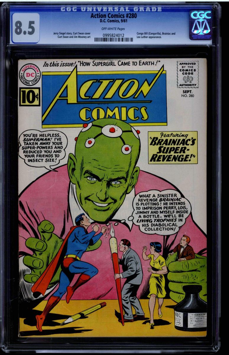 Action Comics #280 CGC 8.5 off-white pages. Jerry Siegel story, Curt Swan cover, Curt Swan and Jim Mooney art. Congo Bill (Congorilla), Brainiac and Lex Luthor appearance. Overstreet 2009 VF 8.0 value = $112, VF/NM 9.0 value = $176. CGC census: 2 at 8.5, 3 higher.