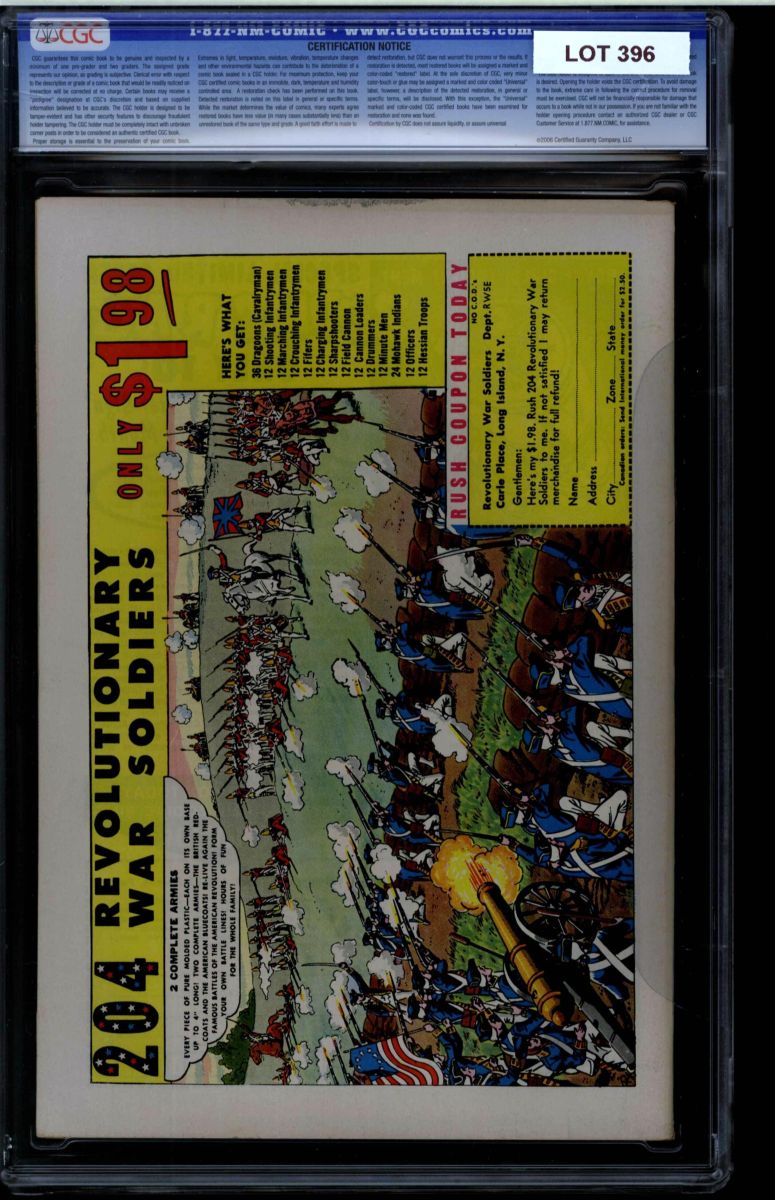 The Auctioneer has reserved the right to reject any and all bids, and to bid at the auction. Auctioneers Auctions are not on approval. Auctioneer does not allow certified material to be returned because of possible differences of opinion with respect to the grade offered by any third party organization, dealer, or service. Absolutely no guarantee of grade is offered for un-certified property sold and subsequently submitted to a third-party grading service. There will be no exceptions to this policy. Under extremely limited circumstances, (e.g. gross cataloging error) a purchaser, who did not bid from the floor, may request Auctioneer to evaluate voiding a sale; such request must be made in writing detailing the alleged gross error, and submission of the lot to the Auctioneer must be pre-approved by the Auctioneer. Bidder must notify Auctioneer in writing of such request within three (3) days of the non-floor bidder receipt of the lot. Any lot that is to be evaluated must be in our offices within 30 days after Auction. Grading does not qualify for this evaluation process nor do such complaints constitute a basis to challenge the authenticity of a lot. AFTER THAT 30-DAY PERIOD, NO LOTS MAY BE RETURNED FOR REASONS OTHER THAN AUTHENTICITY. Lots returned must be housed intact in the original holder. No lots purchased by floor Bidders may be returned (including those Bidders acting as agents for others). Late remittance for purchases may be considered just cause to revoke all return privileges. B: Auctions conducted solely on the Internet have a THREE (3) DAY RETURN POLICY: Lots paid for within seven days of the Auction closing are sold with a three (3) day return privilege. You may return lots under the following conditions: Within three days of receipt of the lot, you must first notify Auctioneer by contacting Client Service by phone (314-680-8599) or e-mail (moundcityauctions@gmail.com), and immediately mail the lot(s) fully insured to the attention of Returns, Mound City Auctions 1081 Teson Rd. Hazelwood, MO. 63042. Lots must be housed intact in their original holder and in their original condition. You are responsible for the insured, safe delivery of any lots. Auctioneer will not be responsible for lots returned in non-registered mail or lots returned without prior authorization per section B. A non-negotiable return fee of 5% of the purchase price ($10 per lot minimum) will be deducted from the refund for each returned lot or billed directly. Postage and handling fees are not refunded. After the three-day period (from receipt), no items may be returned for any reason. Late remittance for purchases revokes all Return-Restock privileges. C: Bidders who have inspected the lots prior to the auction will not be granted any return privileges. D: Comic books sold referencing a third-party grading service are sold “as is” without any express or implied warranty. Certain warranties may be available from the grading services and the Bidder is referred to them for further details: Certified Guaranty Company, LLC. (CGC), P.O. Box 4738, Sarasota, FL 34230. E: Bidders who intend to challenge authenticity or provenance of a lot must notify Auctioneer in writing within thirty (30) days of the Auctions conclusion. In the event Auctioneer cannot deliver the lot or subsequently it is established that the lot lacks title, provenance, authenticity, or other transfer or condition issue is claimed, Auctioneer's liability shall be limited to rescission of sale and refund of purchase price; in no case shall Auctioneer's maximum liability exceed the high bid on that lot, which bid shall be deemed for all purposes the value of the lot. After one year has elapsed, Auctioneer's maximum liability shall be limited to any commissions and fees Auctioneer earned on that lot. F: All comics are guaranteed genuine, but are not guaranteed as to grade, since grading is a matter of opinion, an art and not a science, and therefore the opinion rendered by the Auctioneer or any third party grading service may not agree with the opinion of others (including trained experts), and the same expert may not grade the same item with the same grade at two different times. G: Since we cannot examine encapsulated comics, they are sold “as is”without our grading opinion, and may not be returned for any reason. Auctioneer shall not be liable for any patent or latent defect or controversy pertaining to or arising from any encapsulated collectible. In any such instance, purchaser's remedy, if any, shall be solely against the service certifying the collectible. H: Due to changing grading standards over time, differing interpretations, and to possible mishandling of items by subsequent owners, Auctioneer reserves the right to grade items differently than shown on certificates from any grading service that accompany the items. Auctioneer also reserves the right to grade items differently than the grades shown in the prior catalog should such items be reconsigned to any future auction. I: Although consensus grading is employed by most grading services, it should be noted as aforesaid that grading is not an exact science. In fact, it is entirely possible that if a lot is broken out of a plastic holder and resubmitted to another grading service or even to the same service, the lot could come back with a different grade assigned. J: Certification does not guarantee protection against the normal risks associated with potentially volatile markets. The degree of liquidity for certified collectibles will vary according to general market conditions and the particular lot involved. For some lots there may be no active market at all at certain points in time."