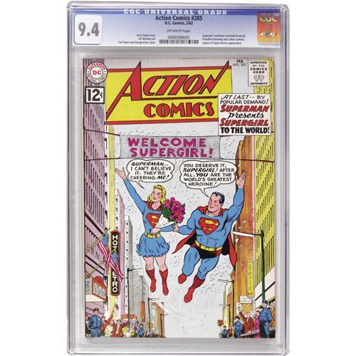 <B>Action Comics #285 (DC, 1962) CGC NM 9.4 Off-white pages.</B></I> A different 9.4 copy was offered at our last Signature auction, and when all was said and done, the final price was $3,346! Since no 9.6 or better has yet been certified, this one looks awfully good. The key event here was that Supergirl's existence was revealed to the world -- she had been the Man of Steel's "secret emergency weapon" for the previous first three years' worth of stories. Also appearing are the Legion of Super-Heroes, Luthor, President Kennedy, and even Jackie Kennedy. Overstreet 2006 NM- 9.2 value = $240. CGC census 3/07: 4 in 9.4, none higher.<BR><BR><b>Shipping:</b> Comics - Slabbed (certified) (<a target="_blank" href="http://www.heritageauctions.com/common/shipping.php">view shipping information</a>)