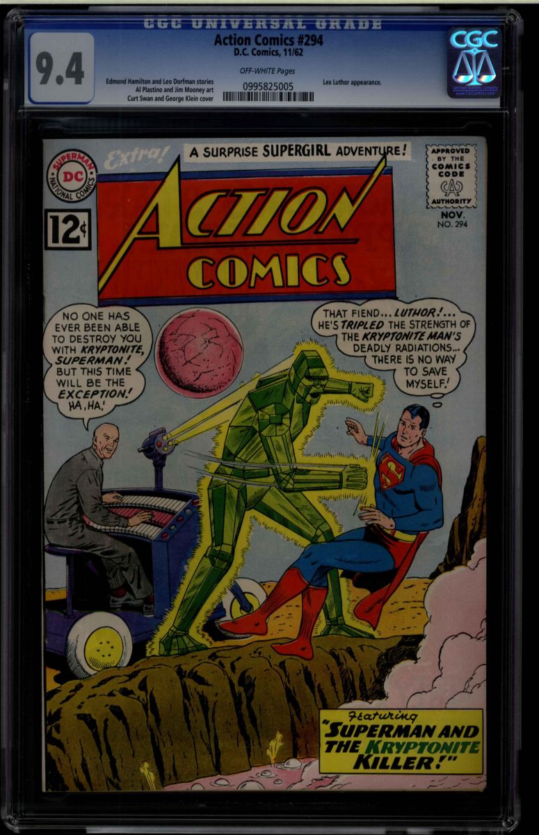 Action Comics #294 CGC 9.4 off-white pages. Edmond Hamilton and Leo Dorfman stories. Al Plastino and Jim Mooney art. Curt Swan and George Klein cover. Lex Luthor appearance. Overstreet 2009 NM 9.2 value = $200. CGC census: 1 at 9.4, none higher!