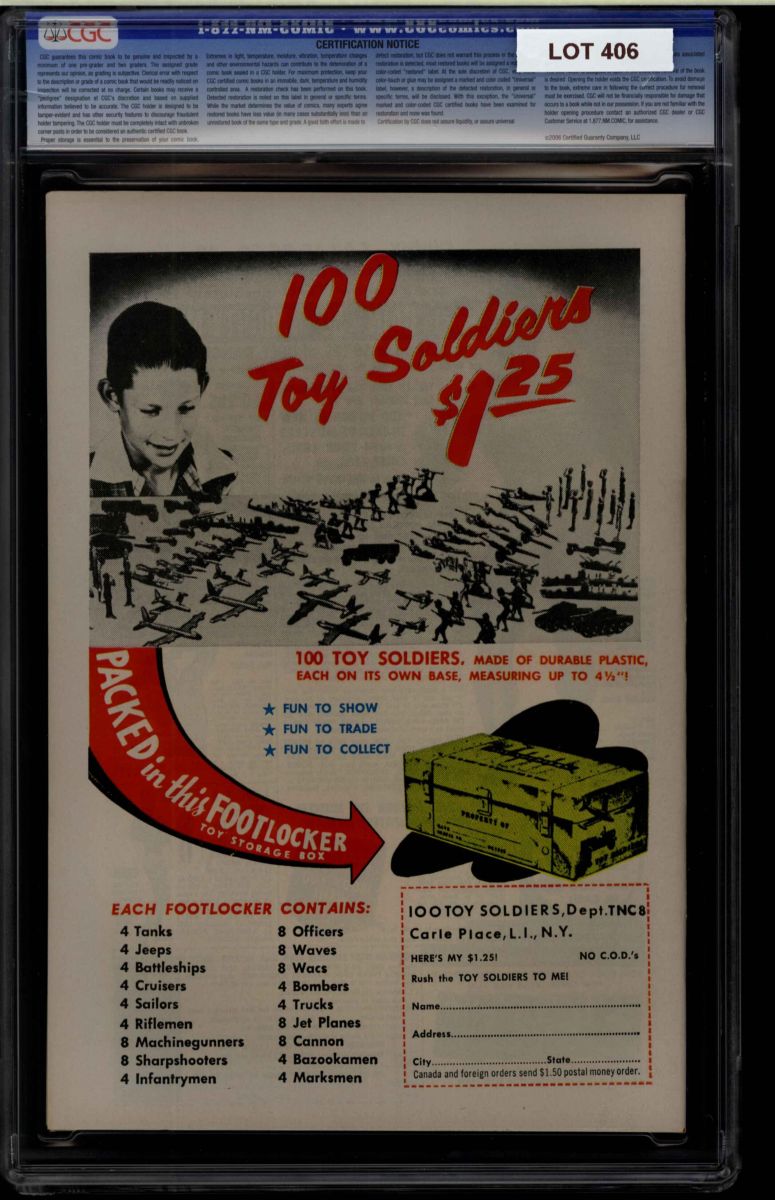 The Auctioneer has reserved the right to reject any and all bids, and to bid at the auction. Auctioneers Auctions are not on approval. Auctioneer does not allow certified material to be returned because of possible differences of opinion with respect to the grade offered by any third party organization, dealer, or service. Absolutely no guarantee of grade is offered for un-certified property sold and subsequently submitted to a third-party grading service. There will be no exceptions to this policy. Under extremely limited circumstances, (e.g. gross cataloging error) a purchaser, who did not bid from the floor, may request Auctioneer to evaluate voiding a sale; such request must be made in writing detailing the alleged gross error, and submission of the lot to the Auctioneer must be pre-approved by the Auctioneer. Bidder must notify Auctioneer in writing of such request within three (3) days of the non-floor bidder receipt of the lot. Any lot that is to be evaluated must be in our offices within 30 days after Auction. Grading does not qualify for this evaluation process nor do such complaints constitute a basis to challenge the authenticity of a lot. AFTER THAT 30-DAY PERIOD, NO LOTS MAY BE RETURNED FOR REASONS OTHER THAN AUTHENTICITY. Lots returned must be housed intact in the original holder. No lots purchased by floor Bidders may be returned (including those Bidders acting as agents for others). Late remittance for purchases may be considered just cause to revoke all return privileges. B: Auctions conducted solely on the Internet have a THREE (3) DAY RETURN POLICY: Lots paid for within seven days of the Auction closing are sold with a three (3) day return privilege. You may return lots under the following conditions: Within three days of receipt of the lot, you must first notify Auctioneer by contacting Client Service by phone (314-680-8599) or e-mail (moundcityauctions@gmail.com), and immediately mail the lot(s) fully insured to the attention of Returns, Mound City Auctions 1081 Teson Rd. Hazelwood, MO. 63042. Lots must be housed intact in their original holder and in their original condition. You are responsible for the insured, safe delivery of any lots. Auctioneer will not be responsible for lots returned in non-registered mail or lots returned without prior authorization per section B. A non-negotiable return fee of 5% of the purchase price ($10 per lot minimum) will be deducted from the refund for each returned lot or billed directly. Postage and handling fees are not refunded. After the three-day period (from receipt), no items may be returned for any reason. Late remittance for purchases revokes all Return-Restock privileges. C: Bidders who have inspected the lots prior to the auction will not be granted any return privileges. D: Comic books sold referencing a third-party grading service are sold “as is” without any express or implied warranty. Certain warranties may be available from the grading services and the Bidder is referred to them for further details: Certified Guaranty Company, LLC. (CGC), P.O. Box 4738, Sarasota, FL 34230. E: Bidders who intend to challenge authenticity or provenance of a lot must notify Auctioneer in writing within thirty (30) days of the Auctions conclusion. In the event Auctioneer cannot deliver the lot or subsequently it is established that the lot lacks title, provenance, authenticity, or other transfer or condition issue is claimed, Auctioneer's liability shall be limited to rescission of sale and refund of purchase price; in no case shall Auctioneer's maximum liability exceed the high bid on that lot, which bid shall be deemed for all purposes the value of the lot. After one year has elapsed, Auctioneer's maximum liability shall be limited to any commissions and fees Auctioneer earned on that lot. F: All comics are guaranteed genuine, but are not guaranteed as to grade, since grading is a matter of opinion, an art and not a science, and therefore the opinion rendered by the Auctioneer or any third party grading service may not agree with the opinion of others (including trained experts), and the same expert may not grade the same item with the same grade at two different times. G: Since we cannot examine encapsulated comics, they are sold “as is”without our grading opinion, and may not be returned for any reason. Auctioneer shall not be liable for any patent or latent defect or controversy pertaining to or arising from any encapsulated collectible. In any such instance, purchaser's remedy, if any, shall be solely against the service certifying the collectible. H: Due to changing grading standards over time, differing interpretations, and to possible mishandling of items by subsequent owners, Auctioneer reserves the right to grade items differently than shown on certificates from any grading service that accompany the items. Auctioneer also reserves the right to grade items differently than the grades shown in the prior catalog should such items be reconsigned to any future auction. I: Although consensus grading is employed by most grading services, it should be noted as aforesaid that grading is not an exact science. In fact, it is entirely possible that if a lot is broken out of a plastic holder and resubmitted to another grading service or even to the same service, the lot could come back with a different grade assigned. J: Certification does not guarantee protection against the normal risks associated with potentially volatile markets. The degree of liquidity for certified collectibles will vary according to general market conditions and the particular lot involved. For some lots there may be no active market at all at certain points in time."
