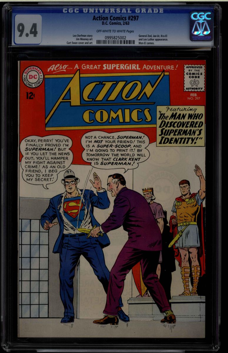 Action Comics #297 CGC 9.4 off-white to white pages. Leo Dorfman story, Jim Mooney art, Curt Swan cover and art. General Zod, Jax-Ur, Kru-El and Lex Luthor appearance. Mon-El cameo. Overstreet 2009 NM 9.2 value = $200. CGC census: 3 at 9.4, none higher.