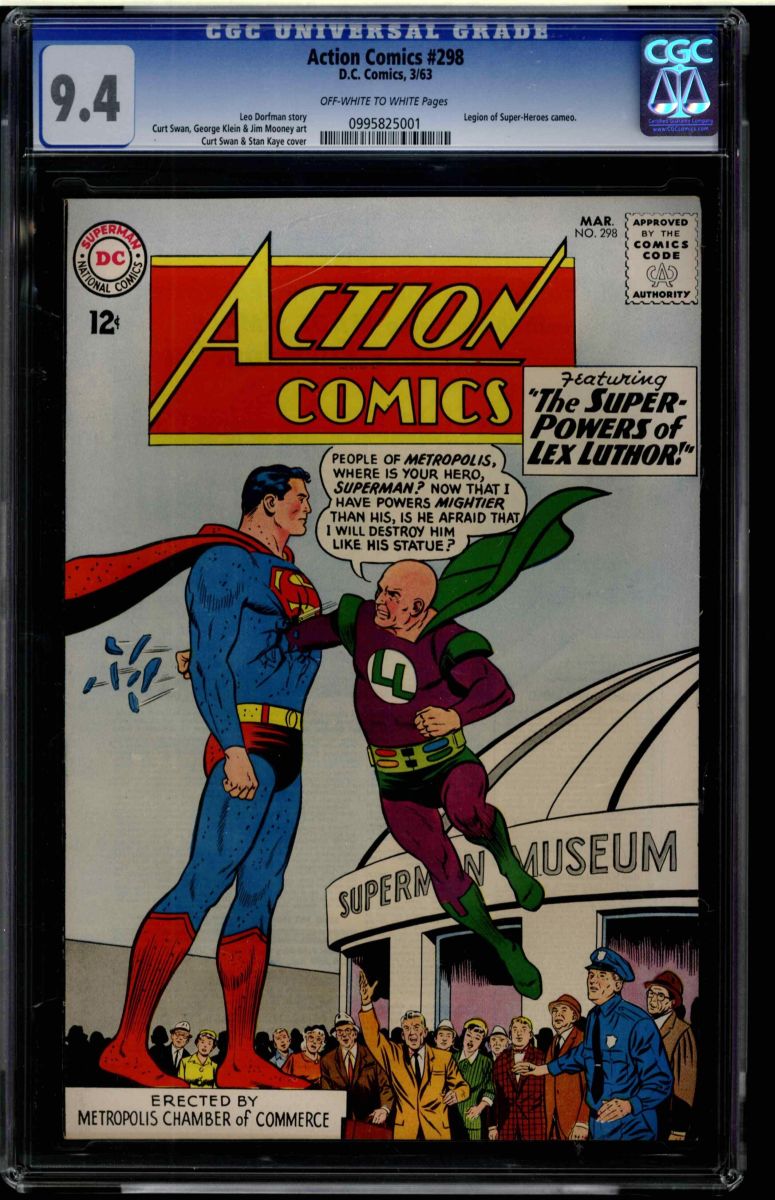 Action Comics #298 CGC 9.4 off-white to white pages. Leo Dorfman story. Curt Swan, George Klein, & Jim Mooney art. Curt Swan and Stan Kaye cover. Legion of Super-Heroes cameo. Overstreet 2009 NM 9.2 value = $200. CGC census: 2 at 9.4, none higher.