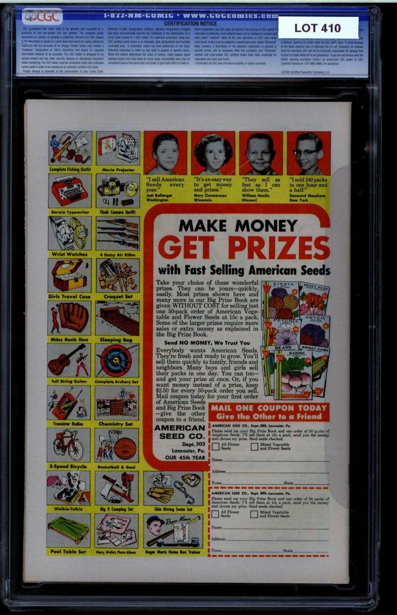 The Auctioneer has reserved the right to reject any and all bids, and to bid at the auction. Auctioneers Auctions are not on approval. Auctioneer does not allow certified material to be returned because of possible differences of opinion with respect to the grade offered by any third party organization, dealer, or service. Absolutely no guarantee of grade is offered for un-certified property sold and subsequently submitted to a third-party grading service. There will be no exceptions to this policy. Under extremely limited circumstances, (e.g. gross cataloging error) a purchaser, who did not bid from the floor, may request Auctioneer to evaluate voiding a sale; such request must be made in writing detailing the alleged gross error, and submission of the lot to the Auctioneer must be pre-approved by the Auctioneer. Bidder must notify Auctioneer in writing of such request within three (3) days of the non-floor bidder receipt of the lot. Any lot that is to be evaluated must be in our offices within 30 days after Auction. Grading does not qualify for this evaluation process nor do such complaints constitute a basis to challenge the authenticity of a lot. AFTER THAT 30-DAY PERIOD, NO LOTS MAY BE RETURNED FOR REASONS OTHER THAN AUTHENTICITY. Lots returned must be housed intact in the original holder. No lots purchased by floor Bidders may be returned (including those Bidders acting as agents for others). Late remittance for purchases may be considered just cause to revoke all return privileges. B: Auctions conducted solely on the Internet have a THREE (3) DAY RETURN POLICY: Lots paid for within seven days of the Auction closing are sold with a three (3) day return privilege. You may return lots under the following conditions: Within three days of receipt of the lot, you must first notify Auctioneer by contacting Client Service by phone (314-680-8599) or e-mail (moundcityauctions@gmail.com), and immediately mail the lot(s) fully insured to the attention of Returns, Mound City Auctions 1081 Teson Rd. Hazelwood, MO. 63042. Lots must be housed intact in their original holder and in their original condition. You are responsible for the insured, safe delivery of any lots. Auctioneer will not be responsible for lots returned in non-registered mail or lots returned without prior authorization per section B. A non-negotiable return fee of 5% of the purchase price ($10 per lot minimum) will be deducted from the refund for each returned lot or billed directly. Postage and handling fees are not refunded. After the three-day period (from receipt), no items may be returned for any reason. Late remittance for purchases revokes all Return-Restock privileges. C: Bidders who have inspected the lots prior to the auction will not be granted any return privileges. D: Comic books sold referencing a third-party grading service are sold “as is” without any express or implied warranty. Certain warranties may be available from the grading services and the Bidder is referred to them for further details: Certified Guaranty Company, LLC. (CGC), P.O. Box 4738, Sarasota, FL 34230. E: Bidders who intend to challenge authenticity or provenance of a lot must notify Auctioneer in writing within thirty (30) days of the Auctions conclusion. In the event Auctioneer cannot deliver the lot or subsequently it is established that the lot lacks title, provenance, authenticity, or other transfer or condition issue is claimed, Auctioneer's liability shall be limited to rescission of sale and refund of purchase price; in no case shall Auctioneer's maximum liability exceed the high bid on that lot, which bid shall be deemed for all purposes the value of the lot. After one year has elapsed, Auctioneer's maximum liability shall be limited to any commissions and fees Auctioneer earned on that lot. F: All comics are guaranteed genuine, but are not guaranteed as to grade, since grading is a matter of opinion, an art and not a science, and therefore the opinion rendered by the Auctioneer or any third party grading service may not agree with the opinion of others (including trained experts), and the same expert may not grade the same item with the same grade at two different times. G: Since we cannot examine encapsulated comics, they are sold “as is”without our grading opinion, and may not be returned for any reason. Auctioneer shall not be liable for any patent or latent defect or controversy pertaining to or arising from any encapsulated collectible. In any such instance, purchaser's remedy, if any, shall be solely against the service certifying the collectible. H: Due to changing grading standards over time, differing interpretations, and to possible mishandling of items by subsequent owners, Auctioneer reserves the right to grade items differently than shown on certificates from any grading service that accompany the items. Auctioneer also reserves the right to grade items differently than the grades shown in the prior catalog should such items be reconsigned to any future auction. I: Although consensus grading is employed by most grading services, it should be noted as aforesaid that grading is not an exact science. In fact, it is entirely possible that if a lot is broken out of a plastic holder and resubmitted to another grading service or even to the same service, the lot could come back with a different grade assigned. J: Certification does not guarantee protection against the normal risks associated with potentially volatile markets. The degree of liquidity for certified collectibles will vary according to general market conditions and the particular lot involved. For some lots there may be no active market at all at certain points in time."