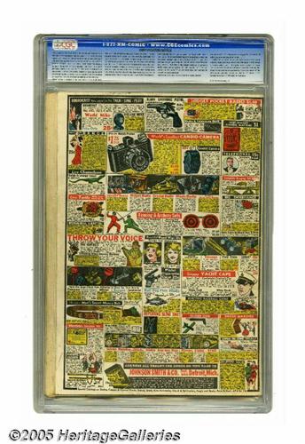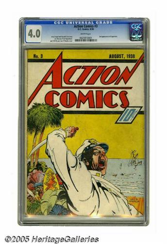 <B>Action Comics #3 (DC, 1938) CGC VG 4.0 White pages.</B></I> The third appearance of Superman comes in this issue that also boasts the distinctive cover stylings of Leo O'Mealia, and interior art from Joe Shuster, Fred Guardineer, and Vincent Sullivan. That Overstreet refers to this issue as "scarce," and the fact that Gerber's <B>Photo-Journal Guide to Comic Books</B></I> gives it a "rare" rating (a Gerber "8" for you numerologists) doesn't surprise us - this is the first time we've ever offered an unrestored copy of this artifact! Even more impressive is that CGC has only certified five unrestored copies to date. The white pages really stand out for this 67 year-old comic! Any way you look at it, this is a key issue of comicdom's most important title, no wonder Overstreet ranks it among the 40 most valuable Golden Age comic books. Overstreet 2005 VG 4.0 value = $4,572. CGC census 5/05: 1 in 4.0, 3 higher.