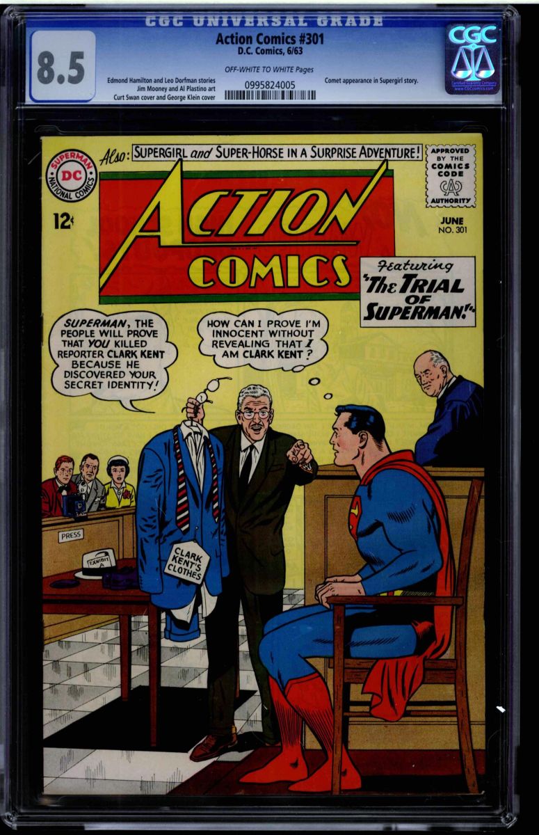 Action Comics #301 CGC 8.5 off-white to white pages. Edmond Hamilton and Leo Dorfman stories. Jim Mooney and Al Plastino art. Curt Swan cover and George Klein cover. Comet appearance in Supergirl story. Overstreet 2009 VF 8.0 value = $58, VF/NM 9.0 value = $97. CGC census: 2 at 8.5, 3 higher.