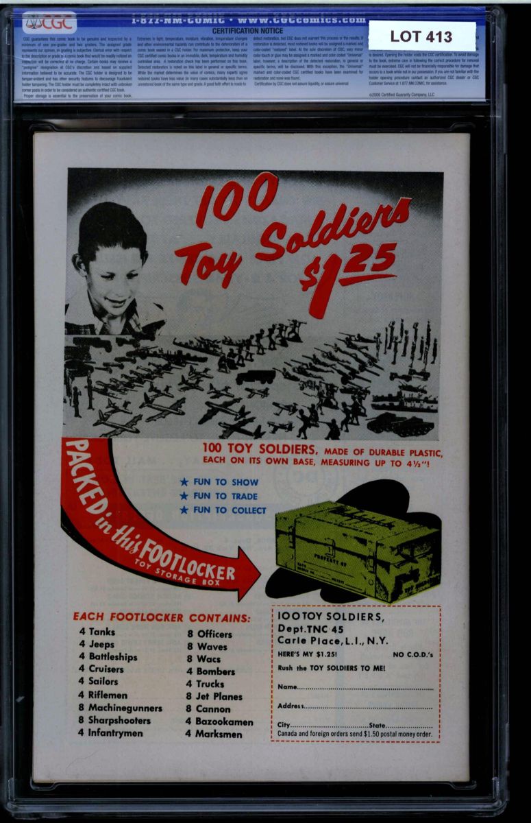 The Auctioneer has reserved the right to reject any and all bids, and to bid at the auction. Auctioneers Auctions are not on approval. Auctioneer does not allow certified material to be returned because of possible differences of opinion with respect to the grade offered by any third party organization, dealer, or service. Absolutely no guarantee of grade is offered for un-certified property sold and subsequently submitted to a third-party grading service. There will be no exceptions to this policy. Under extremely limited circumstances, (e.g. gross cataloging error) a purchaser, who did not bid from the floor, may request Auctioneer to evaluate voiding a sale; such request must be made in writing detailing the alleged gross error, and submission of the lot to the Auctioneer must be pre-approved by the Auctioneer. Bidder must notify Auctioneer in writing of such request within three (3) days of the non-floor bidder receipt of the lot. Any lot that is to be evaluated must be in our offices within 30 days after Auction. Grading does not qualify for this evaluation process nor do such complaints constitute a basis to challenge the authenticity of a lot. AFTER THAT 30-DAY PERIOD, NO LOTS MAY BE RETURNED FOR REASONS OTHER THAN AUTHENTICITY. Lots returned must be housed intact in the original holder. No lots purchased by floor Bidders may be returned (including those Bidders acting as agents for others). Late remittance for purchases may be considered just cause to revoke all return privileges. B: Auctions conducted solely on the Internet have a THREE (3) DAY RETURN POLICY: Lots paid for within seven days of the Auction closing are sold with a three (3) day return privilege. You may return lots under the following conditions: Within three days of receipt of the lot, you must first notify Auctioneer by contacting Client Service by phone (314-680-8599) or e-mail (moundcityauctions@gmail.com), and immediately mail the lot(s) fully insured to the attention of Returns, Mound City Auctions 1081 Teson Rd. Hazelwood, MO. 63042. Lots must be housed intact in their original holder and in their original condition. You are responsible for the insured, safe delivery of any lots. Auctioneer will not be responsible for lots returned in non-registered mail or lots returned without prior authorization per section B. A non-negotiable return fee of 5% of the purchase price ($10 per lot minimum) will be deducted from the refund for each returned lot or billed directly. Postage and handling fees are not refunded. After the three-day period (from receipt), no items may be returned for any reason. Late remittance for purchases revokes all Return-Restock privileges. C: Bidders who have inspected the lots prior to the auction will not be granted any return privileges. D: Comic books sold referencing a third-party grading service are sold “as is” without any express or implied warranty. Certain warranties may be available from the grading services and the Bidder is referred to them for further details: Certified Guaranty Company, LLC. (CGC), P.O. Box 4738, Sarasota, FL 34230. E: Bidders who intend to challenge authenticity or provenance of a lot must notify Auctioneer in writing within thirty (30) days of the Auctions conclusion. In the event Auctioneer cannot deliver the lot or subsequently it is established that the lot lacks title, provenance, authenticity, or other transfer or condition issue is claimed, Auctioneer's liability shall be limited to rescission of sale and refund of purchase price; in no case shall Auctioneer's maximum liability exceed the high bid on that lot, which bid shall be deemed for all purposes the value of the lot. After one year has elapsed, Auctioneer's maximum liability shall be limited to any commissions and fees Auctioneer earned on that lot. F: All comics are guaranteed genuine, but are not guaranteed as to grade, since grading is a matter of opinion, an art and not a science, and therefore the opinion rendered by the Auctioneer or any third party grading service may not agree with the opinion of others (including trained experts), and the same expert may not grade the same item with the same grade at two different times. G: Since we cannot examine encapsulated comics, they are sold “as is”without our grading opinion, and may not be returned for any reason. Auctioneer shall not be liable for any patent or latent defect or controversy pertaining to or arising from any encapsulated collectible. In any such instance, purchaser's remedy, if any, shall be solely against the service certifying the collectible. H: Due to changing grading standards over time, differing interpretations, and to possible mishandling of items by subsequent owners, Auctioneer reserves the right to grade items differently than shown on certificates from any grading service that accompany the items. Auctioneer also reserves the right to grade items differently than the grades shown in the prior catalog should such items be reconsigned to any future auction. I: Although consensus grading is employed by most grading services, it should be noted as aforesaid that grading is not an exact science. In fact, it is entirely possible that if a lot is broken out of a plastic holder and resubmitted to another grading service or even to the same service, the lot could come back with a different grade assigned. J: Certification does not guarantee protection against the normal risks associated with potentially volatile markets. The degree of liquidity for certified collectibles will vary according to general market conditions and the particular lot involved. For some lots there may be no active market at all at certain points in time."