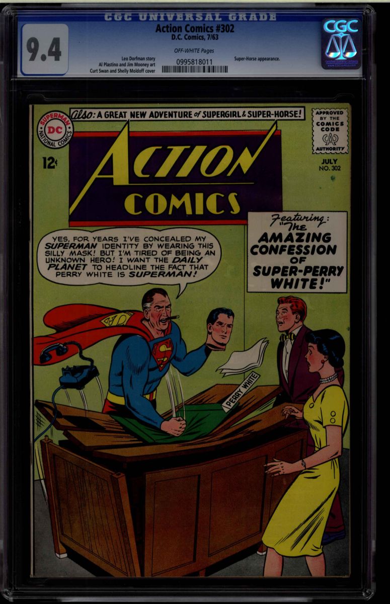 Action Comics #302 CGC 9.4 off-white pages. Leo Dorfman story, Al Plastino and Jim Mooney art. Curt Swan and Shelly Moldoff cover. Super-Horse appearance. Overstreet 2009 NM 9.2 value = $135. CGC census: 5 at 9.4, 1 higher.