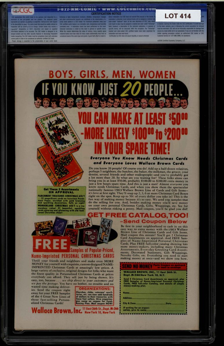 The Auctioneer has reserved the right to reject any and all bids, and to bid at the auction. Auctioneers Auctions are not on approval. Auctioneer does not allow certified material to be returned because of possible differences of opinion with respect to the grade offered by any third party organization, dealer, or service. Absolutely no guarantee of grade is offered for un-certified property sold and subsequently submitted to a third-party grading service. There will be no exceptions to this policy. Under extremely limited circumstances, (e.g. gross cataloging error) a purchaser, who did not bid from the floor, may request Auctioneer to evaluate voiding a sale; such request must be made in writing detailing the alleged gross error, and submission of the lot to the Auctioneer must be pre-approved by the Auctioneer. Bidder must notify Auctioneer in writing of such request within three (3) days of the non-floor bidder receipt of the lot. Any lot that is to be evaluated must be in our offices within 30 days after Auction. Grading does not qualify for this evaluation process nor do such complaints constitute a basis to challenge the authenticity of a lot. AFTER THAT 30-DAY PERIOD, NO LOTS MAY BE RETURNED FOR REASONS OTHER THAN AUTHENTICITY. Lots returned must be housed intact in the original holder. No lots purchased by floor Bidders may be returned (including those Bidders acting as agents for others). Late remittance for purchases may be considered just cause to revoke all return privileges. B: Auctions conducted solely on the Internet have a THREE (3) DAY RETURN POLICY: Lots paid for within seven days of the Auction closing are sold with a three (3) day return privilege. You may return lots under the following conditions: Within three days of receipt of the lot, you must first notify Auctioneer by contacting Client Service by phone (314-680-8599) or e-mail (moundcityauctions@gmail.com), and immediately mail the lot(s) fully insured to the attention of Returns, Mound City Auctions 1081 Teson Rd. Hazelwood, MO. 63042. Lots must be housed intact in their original holder and in their original condition. You are responsible for the insured, safe delivery of any lots. Auctioneer will not be responsible for lots returned in non-registered mail or lots returned without prior authorization per section B. A non-negotiable return fee of 5% of the purchase price ($10 per lot minimum) will be deducted from the refund for each returned lot or billed directly. Postage and handling fees are not refunded. After the three-day period (from receipt), no items may be returned for any reason. Late remittance for purchases revokes all Return-Restock privileges. C: Bidders who have inspected the lots prior to the auction will not be granted any return privileges. D: Comic books sold referencing a third-party grading service are sold “as is” without any express or implied warranty. Certain warranties may be available from the grading services and the Bidder is referred to them for further details: Certified Guaranty Company, LLC. (CGC), P.O. Box 4738, Sarasota, FL 34230. E: Bidders who intend to challenge authenticity or provenance of a lot must notify Auctioneer in writing within thirty (30) days of the Auctions conclusion. In the event Auctioneer cannot deliver the lot or subsequently it is established that the lot lacks title, provenance, authenticity, or other transfer or condition issue is claimed, Auctioneer's liability shall be limited to rescission of sale and refund of purchase price; in no case shall Auctioneer's maximum liability exceed the high bid on that lot, which bid shall be deemed for all purposes the value of the lot. After one year has elapsed, Auctioneer's maximum liability shall be limited to any commissions and fees Auctioneer earned on that lot. F: All comics are guaranteed genuine, but are not guaranteed as to grade, since grading is a matter of opinion, an art and not a science, and therefore the opinion rendered by the Auctioneer or any third party grading service may not agree with the opinion of others (including trained experts), and the same expert may not grade the same item with the same grade at two different times. G: Since we cannot examine encapsulated comics, they are sold “as is”without our grading opinion, and may not be returned for any reason. Auctioneer shall not be liable for any patent or latent defect or controversy pertaining to or arising from any encapsulated collectible. In any such instance, purchaser's remedy, if any, shall be solely against the service certifying the collectible. H: Due to changing grading standards over time, differing interpretations, and to possible mishandling of items by subsequent owners, Auctioneer reserves the right to grade items differently than shown on certificates from any grading service that accompany the items. Auctioneer also reserves the right to grade items differently than the grades shown in the prior catalog should such items be reconsigned to any future auction. I: Although consensus grading is employed by most grading services, it should be noted as aforesaid that grading is not an exact science. In fact, it is entirely possible that if a lot is broken out of a plastic holder and resubmitted to another grading service or even to the same service, the lot could come back with a different grade assigned. J: Certification does not guarantee protection against the normal risks associated with potentially volatile markets. The degree of liquidity for certified collectibles will vary according to general market conditions and the particular lot involved. For some lots there may be no active market at all at certain points in time."
