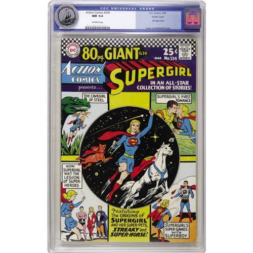 <B>Action Comics #334 Pacific Coast pedigree (DC, 1966) CGC NM 9.4 Off-white pages.</B></I> Also known as <B>80-Page Giant</B></I> G20, this issue contains reprints of the origin stories for Supergirl and the Legion of Super-Heroes, as well as for Supergirl's pets Streaky and Superhorse. The cover art by Curt Swan and Shelly Moldoff is charming and like other Pacific Coast books, this one has remarkably fresh color and gloss. Overstreet 2006 NM- 9.2 value = $165. CGC census 10/06: 4 in 9.4, 4 higher.<BR><BR><b>Shipping:</b> Slabbed Comic (<a target="_blank" href="http://www.heritageauctions.com/common/shipping.php">view shipping information</a>)